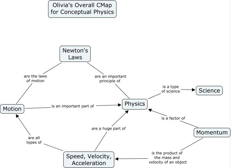 This Concept Map, created with IHMC CmapTools, has information related to: Olivia_Weaver All-Unit Cmap, Motion is an important part of Physics, Speed, Velocity, Acceleration are a huge part of Physics, Momentum is the product of the mass and velocity of an object Speed, Velocity, Acceleration, Newton's Laws are an important principle of Physics, Newton's Laws are the laws of motion Motion, Momentum is a factor of Physics, Physics is a type of science Science, Speed, Velocity, Acceleration are all types of Motion