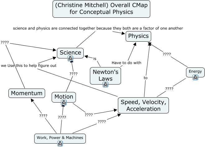 This Concept Map, created with IHMC CmapTools, has information related to: Mitchell_Christine_All-unit_Cmap, Motion ???? Science, Newton's Laws Have to do with Physics, Work, Power & Machines ???? Momentum, Speed, Velocity, Acceleration to Physics, Speed, Velocity, Acceleration we Use this to help figure out Science, Energy ???? Physics, Newton's Laws is Science, Momentum ???? Science, Motion ???? Speed, Velocity, Acceleration, Science science and physics are connected together because they both are a factor of one another Physics, Energy ???? Speed, Velocity, Acceleration, Work, Power & Machines ???? Motion, Work, Power & Machines ???? Speed, Velocity, Acceleration
