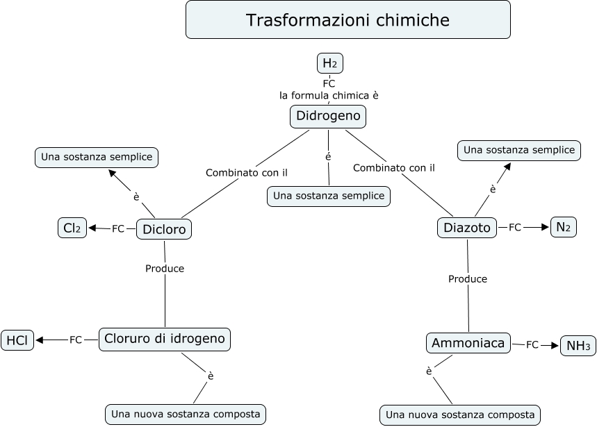 Questa Cmap, creata con IHMC CmapTools, contiene informazioni relative a: Trasformazioni chimiche, Didrogeno Combinato con il Diazoto, Dicloro Produce Cloruro di idrogeno, Dicloro FC Cl2, Ammoniaca FC NH3, Diazoto FC N2, Diazoto Produce Ammoniaca, Cloruro di idrogeno è Una nuova sostanza composta, Ammoniaca è Una nuova sostanza composta, Didrogeno Combinato con il Dicloro, Didrogeno é Una sostanza semplice, Didrogeno FC la formula chimica è H2, Diazoto è Una sostanza semplice, Cloruro di idrogeno FC HCl, Dicloro è Una sostanza semplice