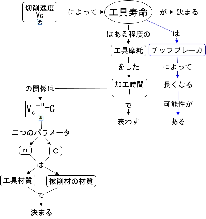 このコンセプトマップに関連する情報: 切削工具の工具寿命, 長くなる 可能性が ある, n は 被削材の材質, C は 工具材質, チップブレーカ によって 長くなる, 工具材質 で 決まる, <math xmlns="http://www.w3.org/1998/Math/MathML"> <mmultiscripts> <mtext> V </mtext> <mtext> c </mtext> <none/> </mmultiscripts> <mmultiscripts> <mtext> T </mtext> <none/> <mtext> n </mtext> </mmultiscripts> <mtext> =C </mtext> </math> 二つのパラメータ C, 工具寿命 が 決まる, 加工時間 T の関係は <math xmlns="http://www.w3.org/1998/Math/MathML"> <mmultiscripts> <mtext> V </mtext> <mtext> c </mtext> <none/> </mmultiscripts> <mmultiscripts> <mtext> T </mtext> <none/> <mtext> n </mtext> </mmultiscripts> <mtext> =C </mtext> </math>, 工具寿命 は チップブレーカ, 被削材の材質 で 決まる, C は 被削材の材質, <math xmlns="http://www.w3.org/1998/Math/MathML"> <mmultiscripts> <mtext> V </mtext> <mtext> c </mtext> <none/> </mmultiscripts> <mmultiscripts> <mtext> T </mtext> <none/> <mtext> n </mtext> </mmultiscripts> <mtext> =C </mtext> </math> 二つのパラメータ n, 工具摩耗 をした 加工時間 T, 切削速度 Vc によって 工具寿命, n は 工具材質, 加工時間 T で 表わす, 工具寿命 はある程度の 工具摩耗, 切削速度 Vc の関係は <math xmlns="http://www.w3.org/1998/Math/MathML"> <mmultiscripts> <mtext> V </mtext> <mtext> c </mtext> <none/> </mmultiscripts> <mmultiscripts> <mtext> T </mtext> <none/> <mtext> n </mtext> </mmultiscripts> <mtext> =C </mtext> </math>