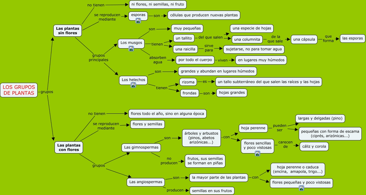 Este Cmap, tiene información relacionada con: Los grupos de plantas, Los helechos tienen frondas, Las plantas sin flores grupos principales Los musgos, árboles y arbustos (pinos, abetos arizónicas...) con hoja perenne, Las angiospermas son la mayor parte de las plantas, Las plantas con flores grupos Las angiospermas, hoja perenne pueden ser largas y delgadas (pino), Las plantas con flores grupos Las gimnospermas, Las plantas sin flores se reproducen mediante esporas, Las angiospermas producen semillas en sus frutos, Los musgos absorben agua por todo el cuerpo, Las gimnospermas son árboles y arbustos (pinos, abetos arizónicas...), Los helechos tienen rizoma, esporas son células que producen nuevas plantas, Las plantas con flores no tienen flores todo el año, sino en alguna época, por todo el cuerpo viven en lugares muy húmedos, rizoma es un tallo subterráneo del que salen las raíces y las hojas, Los musgos son muy pequeñas, la mayor parte de las plantas con flores pequeñas y poco vistosas, un tallito del que salen una especie de hojas, Las plantas sin flores grupos principales Los helechos