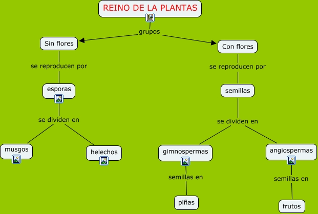 Este Cmap, tiene información relacionada con: Reino de las plantas C, angiospermas semillas en frutos, gimnospermas semillas en piñas, Sin flores se reproducen por esporas, REINO DE LA PLANTAS grupos Con flores, Con flores se reproducen por semillas, esporas se dividen en helechos, REINO DE LA PLANTAS grupos Sin flores, semillas se dividen en angiospermas, esporas se dividen en musgos, semillas se dividen en gimnospermas