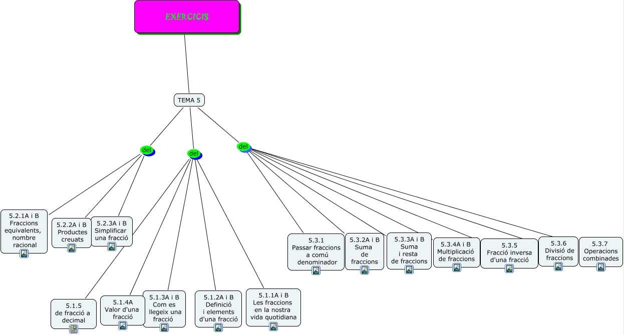 Aquest mapa conceptual conté informació relacionada amb: Tema 5. Exercicis, TEMA 5 del 5.3.1 Passar fraccions a comú denominador, TEMA 5 del 5.2.3A i B Simplificar una fracció, TEMA 5 del 5.3.4A i B Multiplicació de fraccions, TEMA 5 del 5.3.2A i B Suma de fraccions, TEMA 5 del 5.3.7 Operacions combinades, TEMA 5 del 5.2.2A i B Productes creuats, TEMA 5 del 5.3.6 Divisió de fraccions, TEMA 5 del 5.1.5 de fracció a decimal, TEMA 5 del 5.3.3A i B Suma i resta de fraccions, TEMA 5 del 5.1.1A i B Les fraccions en la nostra vida quotidiana, TEMA 5 del 5.1.3A i B Com es llegeix una fracció, TEMA 5 del 5.1.2A i B Definició i elements d'una fracció, TEMA 5 EXERCICIS, TEMA 5 del 5.2.1A i B Fraccions equivalents, nombre racional, TEMA 5 del 5.1.4A Valor d'una fracció, TEMA 5 del 5.3.5 Fracció inversa d'una fracció
