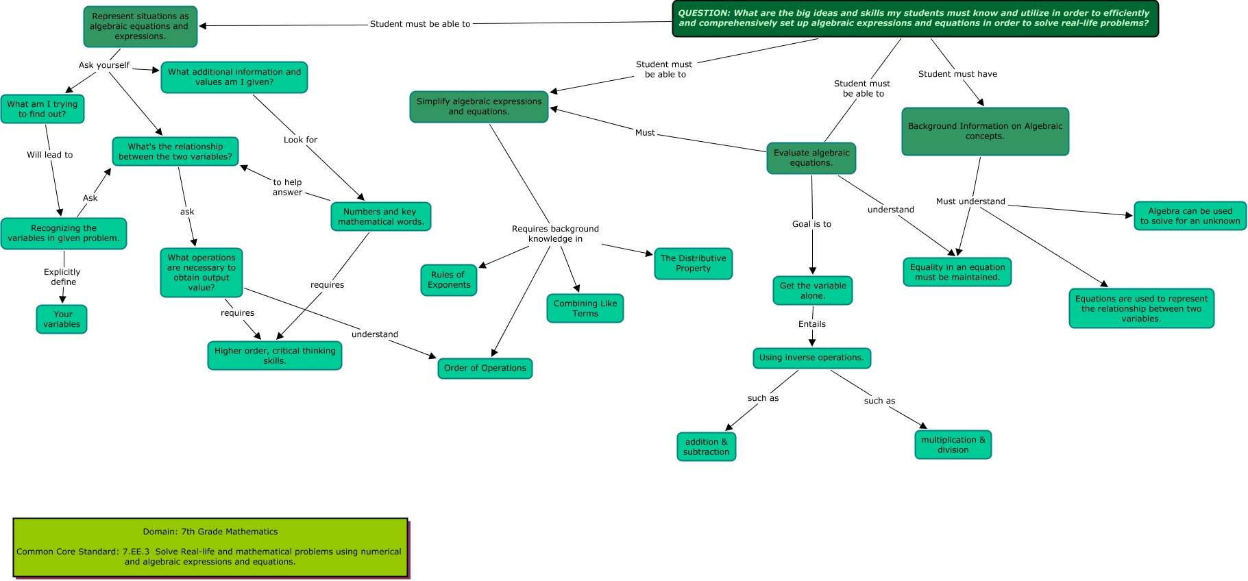 This Concept Map, created with IHMC CmapTools, has information related to: Concept Map, Background Information on Algebraic concepts. Must understand Algebra can be used to solve for an unknown, What's the relationship between the two variables? ask What operations are necessary to obtain output value?, Using inverse operations. such as addition & subtraction, Evaluate algebraic equations. Must Simplify algebraic expressions and equations., QUESTION: What are the big ideas and skills my students must know and utilize in order to efficiently and comprehensively set up algebraic expressions and equations in order to solve real-life problems? Student must be able to Represent situations as algebraic equations and expressions., Evaluate algebraic equations. understand Equality in an equation must be maintained., Numbers and key mathematical words. to help answer What's the relationship between the two variables?, QUESTION: What are the big ideas and skills my students must know and utilize in order to efficiently and comprehensively set up algebraic expressions and equations in order to solve real-life problems? Student must be able to Simplify algebraic expressions and equations., What additional information and values am I given? Look for Numbers and key mathematical words., Numbers and key mathematical words. requires Higher order, critical thinking skills., Recognizing the variables in given problem. Ask What's the relationship between the two variables?, Recognizing the variables in given problem. Explicitly define Your variables, Represent situations as algebraic equations and expressions. Ask yourself What's the relationship between the two variables?, Represent situations as algebraic equations and expressions. Ask yourself What additional information and values am I given?, QUESTION: What are the big ideas and skills my students must know and utilize in order to efficiently and comprehensively set up algebraic expressions and equations in order to solve real-life problems? Student must have Background Information on Algebraic concepts., What operations are necessary to obtain output value? requires Higher order, critical thinking skills., Simplify algebraic expressions and equations. Requires background knowledge in Combining Like Terms, Get the variable alone. Entails Using inverse operations., Simplify algebraic expressions and equations. Requires background knowledge in The Distributive Property, Using inverse operations. such as multiplication & division
