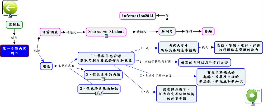 此概念图以 IHMC CmapTools 创建, 内含信息有关于: 第一专题 课程概述及信息检索基础知识, Socrative Student 请输入 房间号, 房间号 等待 答题, 第一专题内容 周二 包括 课前调查, 房间号 为 information2014, 1、掌握信息资源 获取与利用技能的作用和意义 1、是 当代大学生 所应具备的基本技能, 1、掌握信息资源 获取与利用技能的作用和意义 3、有助于了解和把握 有关学科领域的 起源、发展及出现的 新思想、新观点和新知识, 第一专题内容 周二 包括 绪论, 课前调查 请进入 Socrative Student, 寇继虹 制作 第一专题内容 周二, 1、掌握信息资源 获取与利用技能的作用和意义 2、有助于获取与利用 所需的各种信息和专门知识, 绪论 主要内容有 3、信息检索基础知识, 绪论 主要内容有 1、掌握信息资源 获取与利用技能的作用和意义, 1、掌握信息资源 获取与利用技能的作用和意义 4、是 接受终身教育、 扩大和完善知识结构 的必要手段, 当代大学生 所应具备的基本技能 提高 查检、鉴别、选择、评价 与利用信息资源的能力, 绪论 主要内容有 2、信息素养的内涵