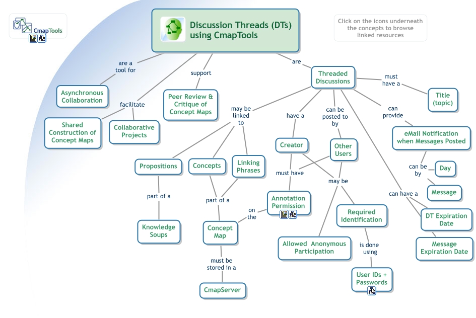 This Concept Map, created with IHMC CmapTools, has information related to: CmapTools - Discussion Threads, Click on the icons underneath the concepts to browse linked resources facilitate Shared Construction of Concept Maps, Creator may be Allowed Anonymous Participation, Required Identification is done using User IDs + Passwords, Threaded Discussions can provide eMail Notification when Messages Posted, Concept Map must be stored in a CmapServer, Threaded Discussions may be linked to Propositions, Threaded Discussions can have a Message Expiration Date, Click on the icons underneath the concepts to browse linked resources support Peer Review & Critique of Concept Maps, Click on the icons underneath the concepts to browse linked resources are Threaded Discussions, Threaded Discussions can have a DT Expiration Date, Threaded Discussions can be posted to by Other Users, Other Users may be Required Identification, Linking Phrases part of a Concept Map, Propositions part of a Knowledge Soups, Threaded Discussions may be linked to Concepts, Threaded Discussions may be linked to Linking Phrases, eMail Notification when Messages Posted can be by Message, Threaded Discussions must have a Title (topic), Annotation Permission on the Concept Map, Other Users must have Annotation Permission