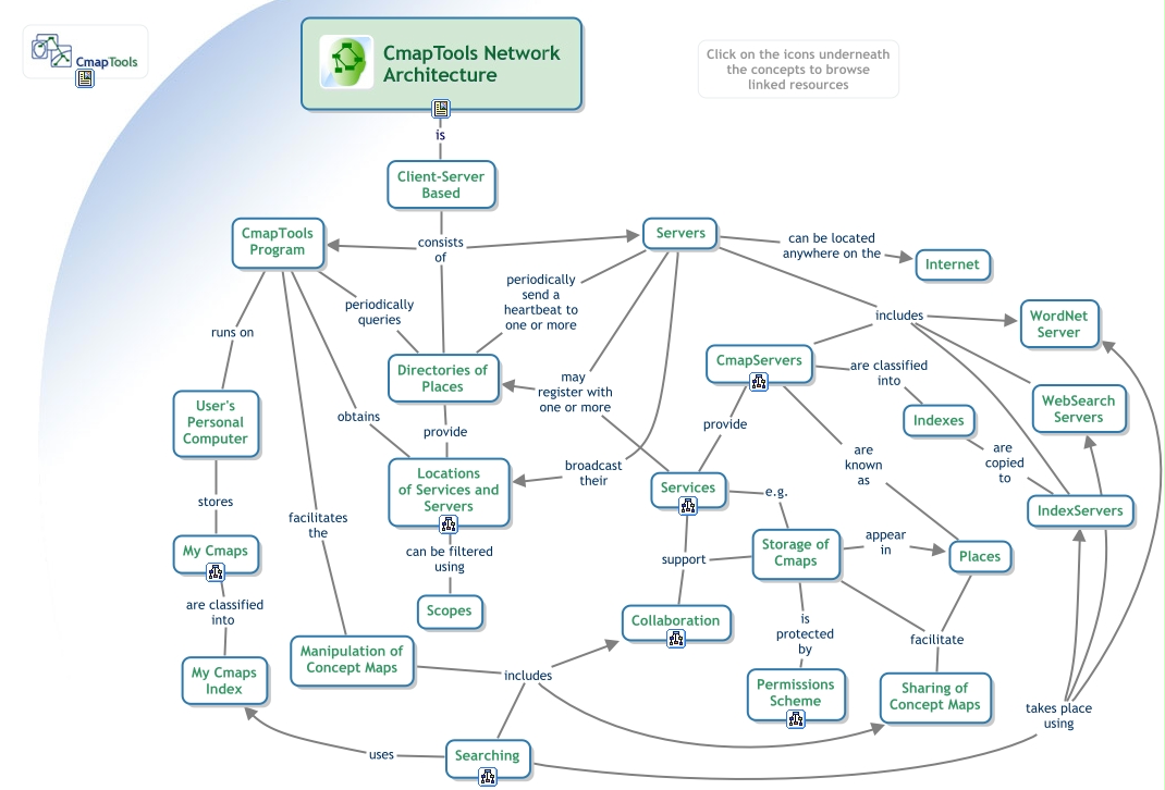 This Concept Map, created with IHMC CmapTools, has information related to: CmapTools - Network Architecture, User's Personal Computer stores My Cmaps, Locations of Services and Servers can be filtered using Scopes, Servers can be located anywhere on the Internet, Servers may register with one or more Directories of Places, Client-Server Based consists of Directories of Places, Searching takes place using WebSearch Servers, Storage of Cmaps is protected by Permissions Scheme, CmapTools Program runs on User's Personal Computer, My Cmaps are classified into My Cmaps Index, Services may register with one or more Directories of Places, CmapServers provide Services, Manipulation of Concept Maps includes Collaboration, CmapTools Network Architecture is Client-Server Based, Searching uses My Cmaps Index, CmapServers are classified into Indexes, Servers includes CmapServers, Storage of Cmaps support Collaboration, Places facilitate Sharing of Concept Maps, Servers includes WordNet Server, Servers includes WebSearch Servers