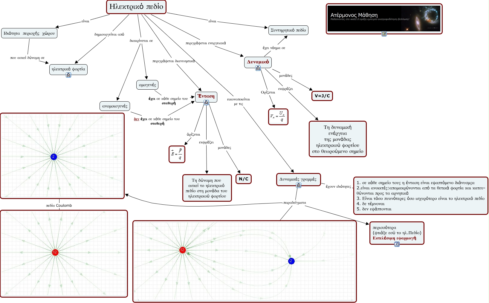 This Concept Map, created with IHMC CmapTools, has information related to: electric field, Δυναμικές γραμμές παραδείγματα, Δυναμικό μονάδες V=J/C, Ηλεκτρικό πεδίο περιγράφεται ενεργειακά Δυναμικό, Ένταση μονάδες N/C, Δυναμικό εκφράζει Τη δυναμική ενέργεια της μονάδας ηλεκτρικού φορτίου στο θεωρούμενο σημείο, Ηλεκτρικό πεδίο εικονοποιείται με τις Δυναμικές γραμμές, Δυναμικές γραμμές έχουν ιδιότητες 1. σε κάθε σημείο τους η ένταση είναι εφαπτόμενο διάνυσμςα 2.είναι ανοικτές:απομακρύνονται από τα θετικά φορτία και κατευ- θύνονται προς τα αρνητικά 3. Είναι τόσο πυκνότερες όσο ισχυρότερο είναι το ηλεκτρικό πεδίο 4. δε τέμνοναι 5. δεν εφάπτονται, Ηλεκτρικό πεδίο περιγράφεται διανυσμτικά Ένταση, Ένταση εκφράζει Τη δύναμη που ασκεί το ηλεκτρικό πεδίο στη μονάδα του ηλεκτρικού φορτίου, ανομοιογενές δεν έχει σε κάθε σημείο του σταθερή Ένταση, Δυναμικές γραμμές παραδείγματα, Ηλεκτρικό πεδίο δημιουργείται από ηλεκτρικά φορτία, Ηλεκτρικό πεδίο είναι Συντηρητικό πεδίο, Δυναμικό Ορίζεται, Δυναμικές γραμμές παραδείγματα περισσότερα (φτιάξε εσύ το ηλ.Πεδίο) Εκτελέσιμη εφαρμογή, Δυναμικό έχει νόημα σε Συντηρητικό πεδίο, Ηλεκτρικό πεδίο διακρίνεται σε ανομοιογενές, Ηλεκτρικό πεδίο είναι Ιδιότητα περιοχής χώρου, Ιδιότητα περιοχής χώρου που ασκεί δύναμη σε ηλεκτρικά φορτία, Ένταση όρίζεται <math xmlns="http://www.w3.org/1998/Math/MathML"> <mtext> </mtext> </math>