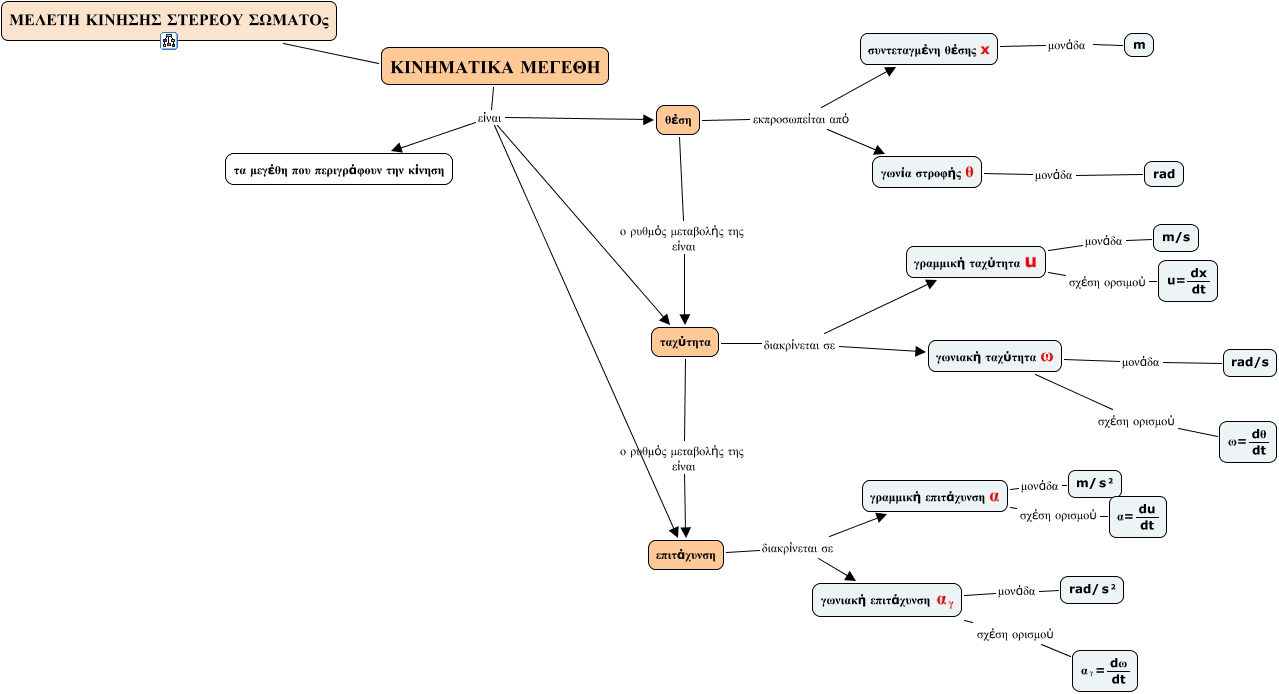 This Concept Map, created with IHMC CmapTools, has information related to: κινηματικά μεγέθη, θέση εκπροσωπείται από γωνία στροφής θ, γραμμική ταχύτητα u μονάδα m/s, συντεταγμένη θέσης x μονάδα m, θέση εκπροσωπείται από συντεταγμένη θέσης x, γραμμική επιτάχυνση α σχέση ορισμού <math xmlns="http://www.w3.org/1998/Math/MathML"> <mrow> <mtext> α= </mtext> <mfrac> <mtext> du </mtext> <mtext> dt </mtext> </mfrac> </mrow> </math>, ταχύτητα ο ρυθμός μεταβολής της είναι επιτάχυνση, επιτάχυνση διακρίνεται σε γραμμική επιτάχυνση α, ταχύτητα διακρίνεται σε γραμμική ταχύτητα u, θέση ο ρυθμός μεταβολής της είναι ταχύτητα, ΚΙΝΗΜΑΤΙΚΑ ΜΕΓΕΘΗ είναι επιτάχυνση, <math xmlns="http://www.w3.org/1998/Math/MathML"> <mrow> <mtext> γωνιακή επιτάχυνση </mtext> <mmultiscripts> <mtext> α </mtext> <mtext> γ </mtext> <none/> </mmultiscripts> </mrow> </math> σχέση ορισμού <math xmlns="http://www.w3.org/1998/Math/MathML"> <mrow> <mmultiscripts> <mtext> α </mtext> <mtext> γ </mtext> <none/> </mmultiscripts> <mtext> = </mtext> <mfrac> <mtext> dω </mtext> <mtext> dt </mtext> </mfrac> </mrow> </math>, γραμμική ταχύτητα u σχέση ορσιμού <math xmlns="http://www.w3.org/1998/Math/MathML"> <mrow> <mtext> u= </mtext> <mfrac> <mtext> dx </mtext> <mtext> dt </mtext> </mfrac> </mrow> </math>, γωνιακή ταχύτητα ω μονάδα rad/s, ΜΕΛΕΤΗ ΚΙΝΗΣΗΣ ΣΤΕΡΕΟΥ ΣΩΜΑΤΟς ΚΙΝΗΜΑΤΙΚΑ ΜΕΓΕΘΗ, ΚΙΝΗΜΑΤΙΚΑ ΜΕΓΕΘΗ είναι θέση, ΚΙΝΗΜΑΤΙΚΑ ΜΕΓΕΘΗ είναι τα μεγέθη που περιγράφουν την κίνηση, γωνία στροφής θ μονάδα rad, γραμμική επιτάχυνση α μονάδα <math xmlns="http://www.w3.org/1998/Math/MathML"> <mtext> m/ </mtext> <mmultiscripts> <mtext> s </mtext> <none/> <mtext> 2 </mtext> </mmultiscripts> </math>, <math xmlns="http://www.w3.org/1998/Math/MathML"> <mrow> <mtext> γωνιακή επιτάχυνση </mtext> <mmultiscripts> <mtext> α </mtext> <mtext> γ </mtext> <none/> </mmultiscripts> </mrow> </math> μονάδα <math xmlns="http://www.w3.org/1998/Math/MathML"> <mrow> <mtext> rad/ </mtext> <mmultiscripts> <mtext> s </mtext> <none/> <mtext> 2 </mtext> </mmultiscripts> </mrow> </math>, ΚΙΝΗΜΑΤΙΚΑ ΜΕΓΕΘΗ είναι ταχύτητα