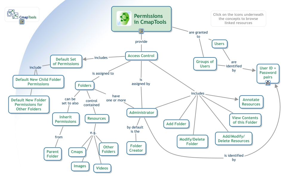 This Concept Map, created with IHMC CmapTools, has information related to: CmapTools - Permissions and Access Control, Permissions in CmapTools are granted to Groups of Users, Permissions in CmapTools are granted to Users, Access Control includes Add Folder, Groups of Users are identified by User ID + Password pairs, Permissions in CmapTools provide Access Control, Resources e.g. Cmaps, Folders can be set to also Inherit Permissions, Administrator is identified by User ID + Password pairs, Administrator by default is the Folder Creator, Access Control includes Add/Modify/ Delete Resources, Access Control includes View Contents of this Folder, Inherit Permissions from Parent Folder, Access Control includes Administrator, Folders have one or more Administrator, Access Control includes Annotate Resources, Resources e.g. Other Folders, Access Control is assigned to Folders, Resources e.g. Images, Access Control includes Default Set of Permissions, Default Set of Permissions include Default New Folder Permissions for Other Folders