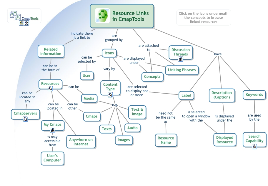 This Concept Map, created with IHMC CmapTools, has information related to: CmapTools - Resource Links, Resource Links in CmapTools are attached to Linking Phrases, Related Information can be in the form of Resources, Resource Links in CmapTools indicate there is a link to Related Information, Media e.g. Texts, Content Type e.g. Text & Image, Keywords are used by the Search Capability, Media e.g. Audio, Resources can be Media, Icons can be selected by User, Content Type e.g. Images, Label need not be the same as Resource Name, Resources can be other Cmaps, Icons are selected to display one or more Label, Content Type e.g. Cmaps, Media e.g. Cmaps, Resources can be located in My Cmaps, Resource Links in CmapTools have Keywords, Resource Links in CmapTools are attached to Discussion Threads, Description (Caption) is displayed under the Displayed Resource, Media e.g. Images