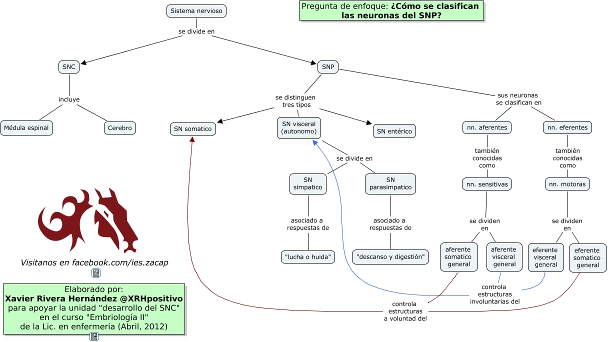Este Cmap, tiene información relacionada con: Neuronas del SNP, SNP sus neuronas se clasifican en nn. aferentes, Sistema nervioso se divide en SNC, SN visceral (autonomo) se divide en SN parasimpatico, nn. sensitivas se dividen en aferente somatico general, SN visceral (autonomo) se divide en SN simpatico, SNP se distinguen tres tipos SN visceral (autonomo), nn. motoras se dividen en eferente visceral general, aferente somatico general controla estructuras a voluntad del SN somatico, nn. sensitivas se dividen en aferente visceral general, eferente visceral general controla estructuras involuntarias del SN visceral (autonomo), nn. aferentes también conocidas como nn. sensitivas, nn. motoras se dividen en eferente somatico general, nn. eferentes también conocidas como nn. motoras, SN parasimpatico asociado a respuestas de "descanso y digestión", SNP sus neuronas se clasifican en nn. eferentes, eferente somatico general controla estructuras a voluntad del SN somatico, SNC incluye Cerebro, SNP se distinguen tres tipos SN entérico, aferente visceral general controla estructuras involuntarias del SN visceral (autonomo), SNP se distinguen tres tipos SN somatico