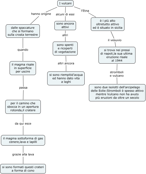 Questa Cmap, creata con IHMC CmapTools, contiene informazioni relative a: i vulcaniFATIMA, si trova nei pressi di napoli,la sua ultima eruzione risale al 1944 stromboli e vulcano sono due isolotti dell'arcipelago delle Eolie:Stromboli è spesso attivo mentre Vulcano non ha avuto più eruzioni da oltre un secolo, I vulcani l'Etna è i più alto oltretutto attivo ed è situato in sicilia, dalle spaccature che si formano sulla crosta terrestre quando il magma risale in superficie per uscire, è i più alto oltretutto attivo ed è situato in sicilia il vesuvio si trova nei pressi di napoli,la sua ultima eruzione risale al 1944, I vulcani hanno origine dalle spaccature che si formano sulla crosta terrestre, il magma risale in superficie per uscire passa per il camino che sbocca in un apertura rotonda,il cratere, sono spenti e ricoperti di vegetazione altri ancora si sono riempitid'acqua ed hanno dato vita a laghi, il magma sottoforma di gas cenere,lava e lapilli grazie alla lava si sono formati questi crateri a forma di cono, sono ancora attivi altri sono spenti e ricoperti di vegetazione, per il camino che sbocca in un apertura rotonda,il cratere da qui esce il magma sottoforma di gas cenere,lava e lapilli, I vulcani alcuni di essi sono ancora attivi