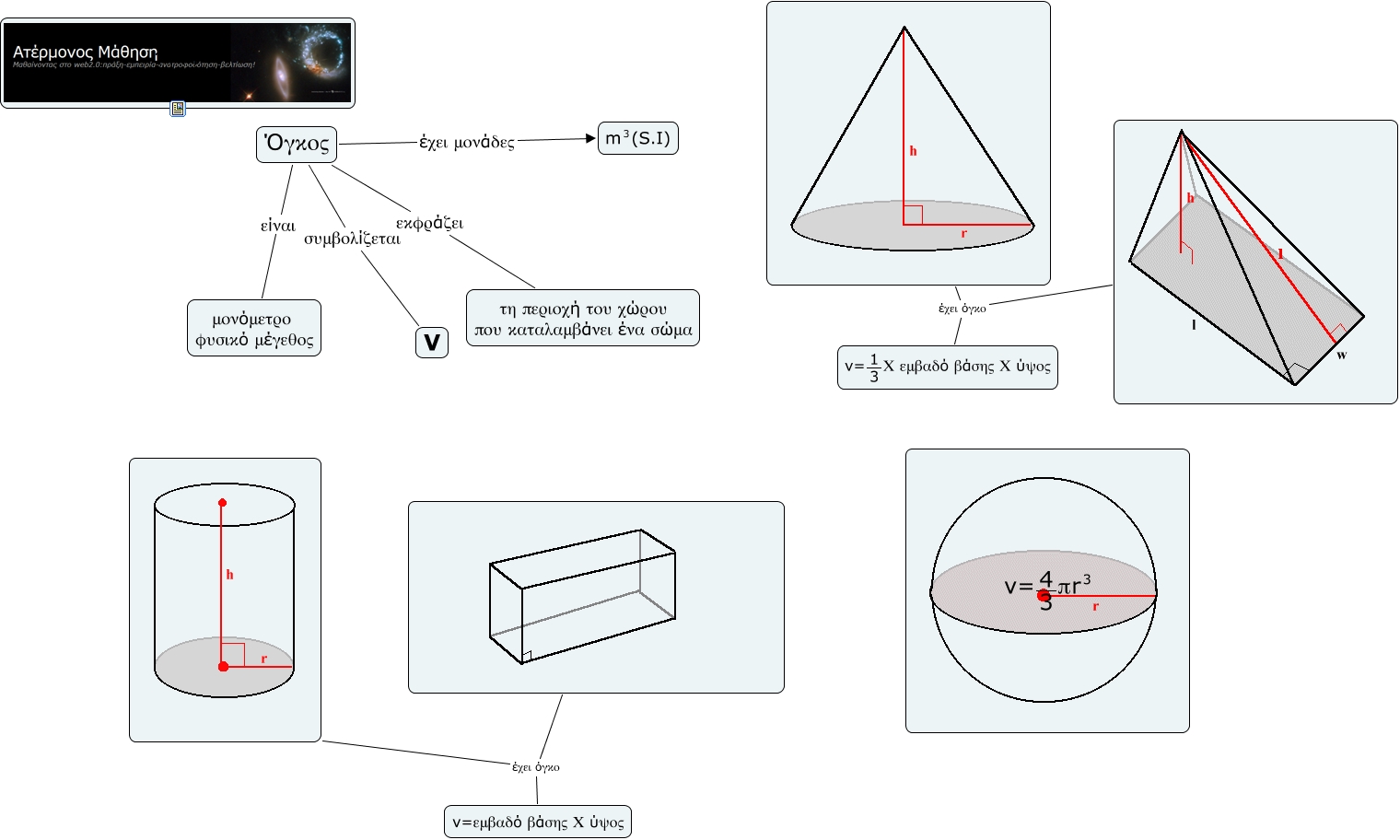 This Concept Map, created with IHMC CmapTools, has information related to: volume, Όγκος συμβολίζεται V, <math xmlns="http://www.w3.org/1998/Math/MathML"> <mrow> <mtext> v= </mtext> <mfrac> <mtext> 1 </mtext> <mtext> 3 </mtext> </mfrac> <mtext> Χ εμβαδό βάσης Χ ύψος </mtext> </mrow> </math> έχει όγκο, Όγκος είναι μονόμετρο φυσικό μέγεθος, <math xmlns="http://www.w3.org/1998/Math/MathML"> <mrow> <mtext> v= </mtext> <mfrac> <mtext> 1 </mtext> <mtext> 3 </mtext> </mfrac> <mtext> Χ εμβαδό βάσης Χ ύψος </mtext> </mrow> </math> έχει όγκο, έχει όγκο, Όγκος εκφράζει τη περιοχή του χώρου που καταλαμβάνει ένα σώμα, έχει όγκο v=εμβαδό βάσης Χ ύψος, Όγκος έχει μονάδες <math xmlns="http://www.w3.org/1998/Math/MathML"> <mrow> <mmultiscripts> <mtext> m </mtext> <none/> <mtext> 3 </mtext> </mmultiscripts> <mtext> (S.I) </mtext> </mrow> </math>