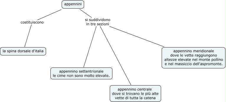 Questa Cmap, creata con IHMC CmapTools, contiene informazioni relative a: appennini_camillo, appennini si suddividono in tre sezioni appennino meridionale dove le vette raggiungono altezze elevate nel monte pollino e nel massiccio dell'aspromonte., appennini costituiscono la spina dorsale d'italia, appennini si suddividono in tre sezioni appennino settentrionale le cime non sono molto elevate., appennini si suddividono in tre sezioni appennino centrale dove si trovano le più alte vette di tutta la catena