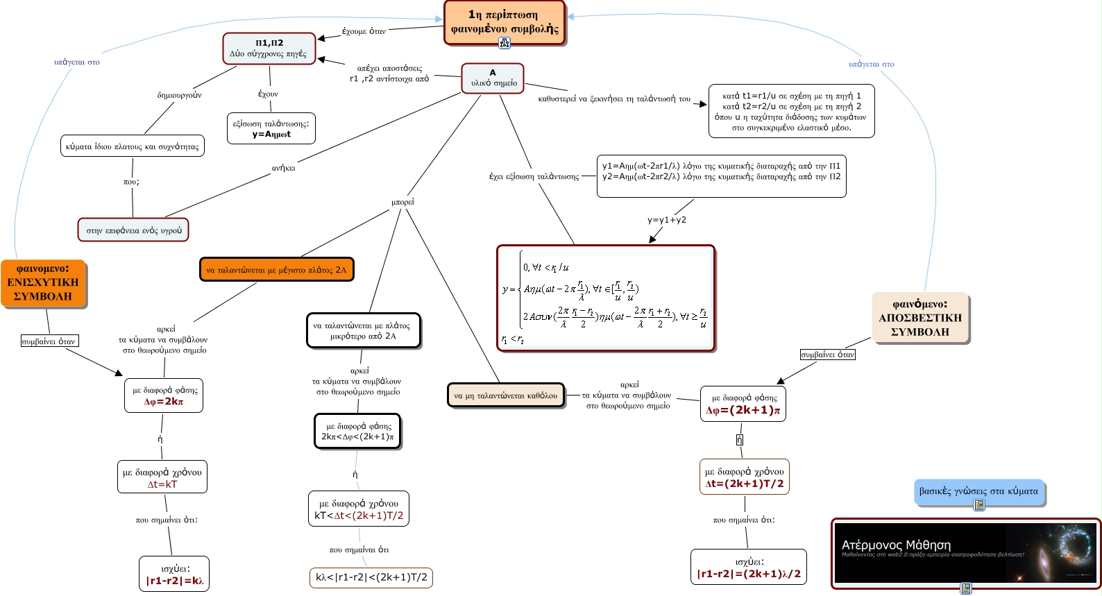 This Concept Map, created with IHMC CmapTools, has information related to: WAVE_INTERFERENCE2, φαινομενο: ΕΝΙΣΧΥΤΙΚΗ ΣΥΜΒΟΛΗ υπάγεται στο 1η περίπτωση φαινομένου συμβολής, A υλικό σημείο ανήκει στην επιφάνεια ενός υγρού, Π1,Π2 Δύο σύγχρονες πηγές έχουν εξίσωση ταλάντωσης: y=Aημωt, A υλικό σημείο έχει εξίσωση ταλάντωσης y1=Aημ(ωt-2πr1/λ) λόγω της κυματικής διαταραχής από την Π1 y2=Aημ(ωt-2πr2/λ) λόγω της κυματικής διαταραχής από την Π2, φαινόμενο: ΑΠΟΣΒΕΣΤΙΚΗ ΣΥΜΒΟΛΗ υπάγεται στο 1η περίπτωση φαινομένου συμβολής, με διαφορά χρόνου kT<Δt<(2k+1)T/2 που σημαίναι ότι kλ<|r1-r2|<(2k+1)T/2, Π1,Π2 Δύο σύγχρονες πηγές δημιουργούν κύματα ίδιου πλατους και συχνότητας, με διαφορά φάσης 2kπ<Δφ<(2k+1)π ή με διαφορά χρόνου kT<Δt<(2k+1)T/2, με διαφορά φάσης Δφ=(2k+1)π ή με διαφορά χρόνου Δt=(2k+1)T/2, να μη ταλαντώνεται καθόλου αρκεί τα κύματα να συμβάλουν στο θεωρούμενο σημείο με διαφορά φάσης Δφ=(2k+1)π, κύματα ίδιου πλατους και συχνότητας που; στην επιφάνεια ενός υγρού, να ταλαντώνεται με μέγιστο πλάτος 2Α αρκεί τα κύματα να συμβάλουν στο θεωρούμενο σημείο με διαφορά φάσης Δφ=2kπ, φαινόμενο: ΑΠΟΣΒΕΣΤΙΚΗ ΣΥΜΒΟΛΗ συμβαίνει όταν με διαφορά φάσης Δφ=(2k+1)π, με διαφορά χρόνου Δt=kT που σημαίνει ότι: ισχύει: |r1-r2|=kλ, A υλικό σημείο απέχει αποστάσεις r1 ,r2 αντίστοιχα από Π1,Π2 Δύο σύγχρονες πηγές, A υλικό σημείο έχει εξίσωση ταλάντωσης, A υλικό σημείο καθυστερεί να ξεκινήσει τη ταλάντωσή του κατά t1=r1/u σε σχέση με τη πηγή 1 κατά t2=r2/u σε σχέση με τη πηγή 2 όπου u η ταχύτητα διάδοσης των κυμάτων στο συγκεκριμένο ελαστικό μέσο., A υλικό σημείο μπορεί να ταλαντώνεται με πλάτος μικρότερο από 2Α, με διαφορά χρόνου Δt=(2k+1)T/2 που σημαίνει ότι: ισχύει: |r1-r2|=(2k+1)λ/2, A υλικό σημείο μπορεί να μη ταλαντώνεται καθόλου