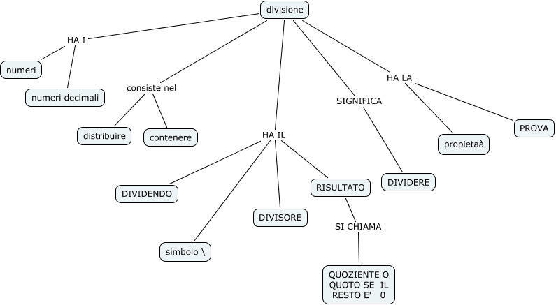 Questa Cmap, creata con IHMC CmapTools, contiene informazioni relative a: divisione_francesco, divisione HA LA propietaà, divisione HA IL DIVIDENDO, divisione SIGNIFICA DIVIDERE, divisione HA I numeri decimali, RISULTATO SI CHIAMA QUOZIENTE O QUOTO SE IL RESTO E' 0, divisione HA LA PROVA, divisione HA IL RISULTATO, divisione HA IL DIVISORE, divisione HA IL simbolo \, divisione consiste nel contenere, divisione consiste nel distribuire, divisione HA I numeri