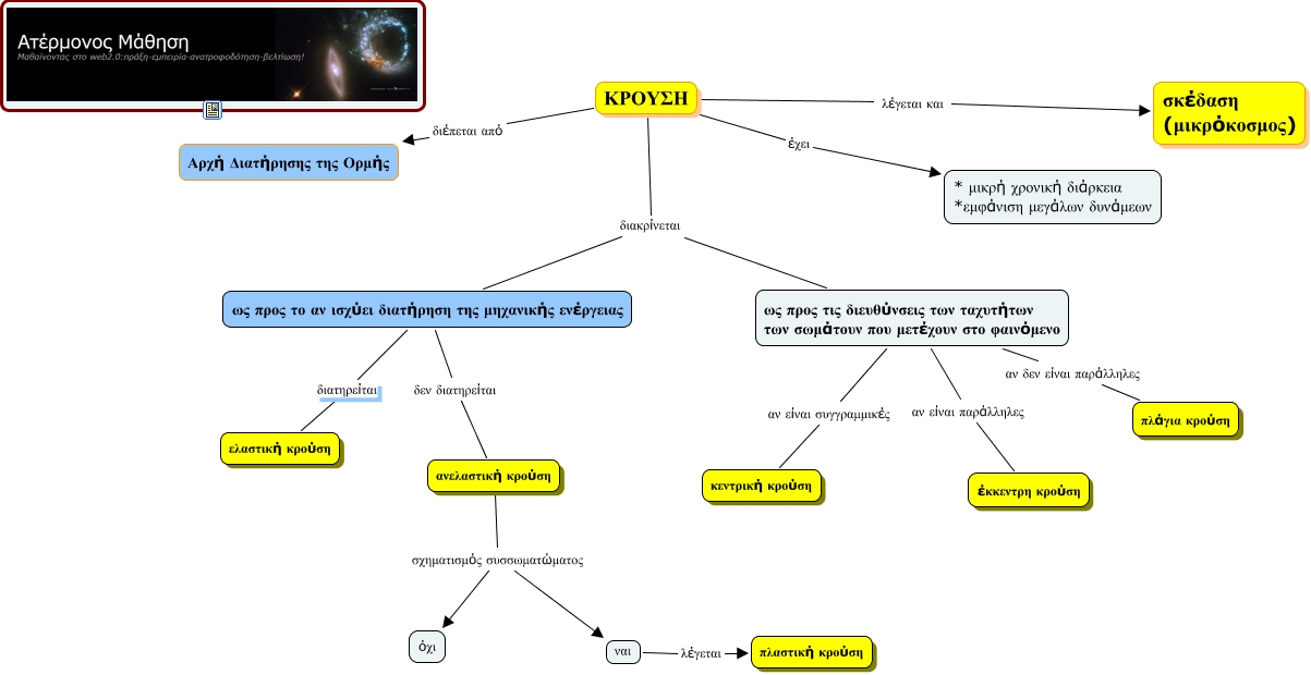 This Concept Map, created with IHMC CmapTools, has information related to: ΕΙΔΗ ΚΡΟΥΣΕΩΝ, ΚΡΟΥΣΗ λέγεται και σκέδαση (μικρόκοσμος), ΚΡΟΥΣΗ διέπεται από Αρχή Διατήρησης της Ορμής, ΚΡΟΥΣΗ έχει * μικρή χρονική διάρκεια *εμφάνιση μεγάλων δυνάμεων, ως προς το αν ισχύει διατήρηση της μηχανικής ενέργειας δεν διατηρείται ανελαστική κρούση, ως προς τις διευθύνσεις των ταχυτήτων των σωμάτουν που μετέχουν στο φαινόμενο αν είναι παράλληλες έκκεντρη κρούση, ως προς τις διευθύνσεις των ταχυτήτων των σωμάτουν που μετέχουν στο φαινόμενο αν δεν είναι παράλληλες πλάγια κρούση, ανελαστική κρούση σχηματισμός συσσωματώματος όχι, ΚΡΟΥΣΗ διακρίνεται ως προς το αν ισχύει διατήρηση της μηχανικής ενέργειας, ναι λέγεται πλαστική κρούση, ως προς τις διευθύνσεις των ταχυτήτων των σωμάτουν που μετέχουν στο φαινόμενο αν είναι συγγραμμικές κεντρική κρούση, ΚΡΟΥΣΗ διακρίνεται ως προς τις διευθύνσεις των ταχυτήτων των σωμάτουν που μετέχουν στο φαινόμενο, ανελαστική κρούση σχηματισμός συσσωματώματος ναι, ως προς το αν ισχύει διατήρηση της μηχανικής ενέργειας διατηρείται ελαστική κρούση