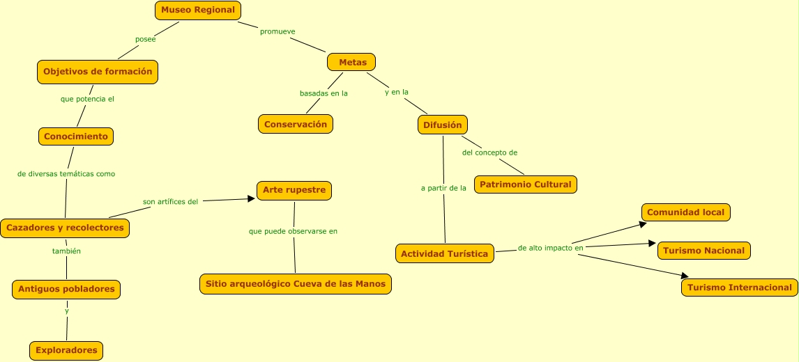 Este Cmap, tiene información relacionada con: Museo Regional, Difusión a partir de la Actividad Turística, Actividad Turística de alto impacto en Comunidad local, Conocimiento de diversas temáticas como Cazadores y recolectores, Cazadores y recolectores son artífices del Arte rupestre, Metas y en la Difusión, Antiguos pobladores y Exploradores, Actividad Turística de alto impacto en Turismo Internacional, Museo Regional posee Objetivos de formación, Metas basadas en la Conservación, Arte rupestre que puede observarse en Sitio arqueológico Cueva de las Manos, Difusión del concepto de Patrimonio Cultural, Museo Regional promueve Metas, Actividad Turística de alto impacto en Turismo Nacional, Objetivos de formación que potencia el Conocimiento, Cazadores y recolectores también Antiguos pobladores