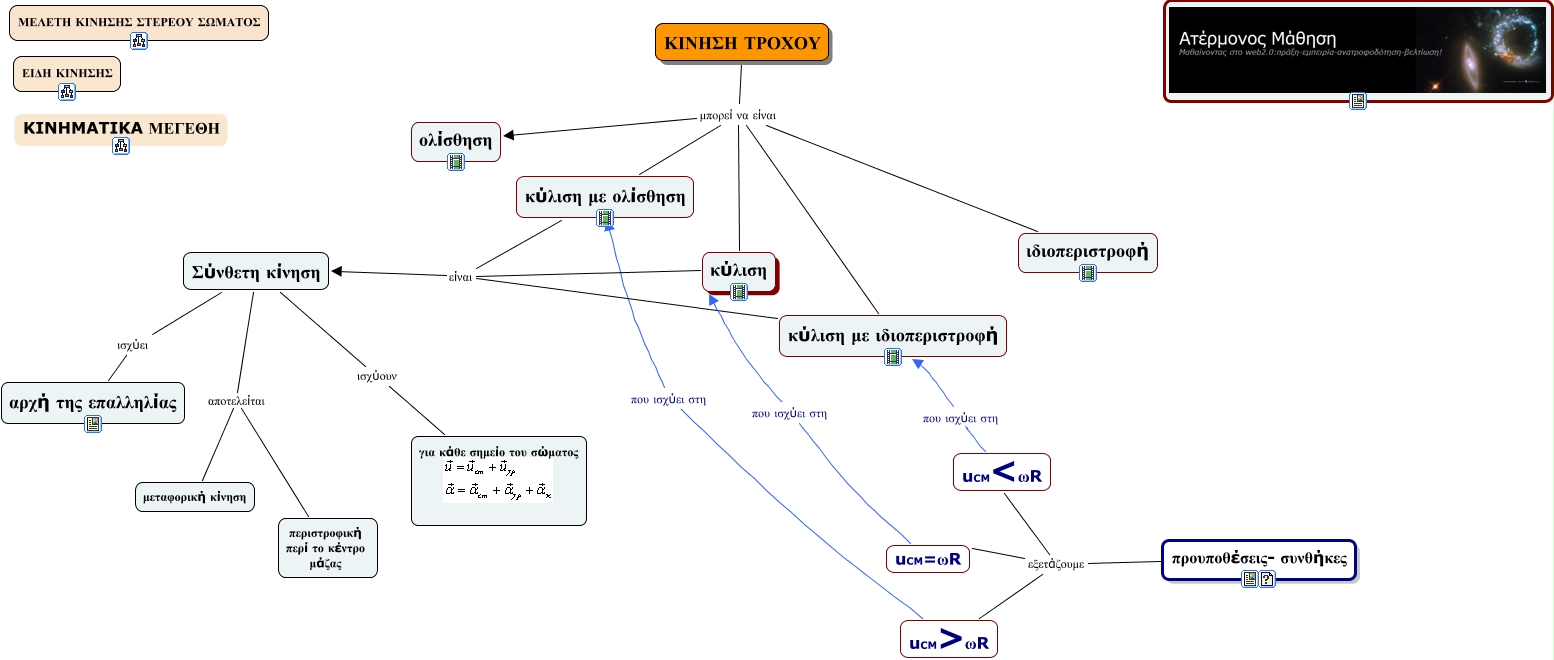 This Concept Map, created with IHMC CmapTools, has information related to: wheel's motion, Σύνθετη κίνηση ισχύουν για κάθε σημείο του σώματος, προυποθέσεις- συνθήκες εξετάζουμε uCM=ωR, κύλιση με ολίσθηση είναι κύλιση με ιδιοπεριστροφή, ΚΙΝΗΣΗ ΤΡΟΧΟΥ μπορεί να είναι κύλιση με ιδιοπεριστροφή, κύλιση με ολίσθηση είναι κύλιση, ΚΙΝΗΣΗ ΤΡΟΧΟΥ μπορεί να είναι κύλιση με ολίσθηση, uCM<ωR που ισχύει στη κύλιση με ιδιοπεριστροφή, προυποθέσεις- συνθήκες εξετάζουμε uCM>ωR, uCM>ωR που ισχύει στη κύλιση με ολίσθηση, uCM=ωR που ισχύει στη κύλιση, ΚΙΝΗΣΗ ΤΡΟΧΟΥ μπορεί να είναι ολίσθηση, κύλιση με ολίσθηση είναι Σύνθετη κίνηση, Σύνθετη κίνηση αποτελείται περιστροφική περί το κέντρο μάζας, Σύνθετη κίνηση αποτελείται μεταφορική κίνηση, ΚΙΝΗΣΗ ΤΡΟΧΟΥ μπορεί να είναι ιδιοπεριστροφή, προυποθέσεις- συνθήκες εξετάζουμε uCM<ωR, Σύνθετη κίνηση ισχύει αρχή της επαλληλίας, ΚΙΝΗΣΗ ΤΡΟΧΟΥ μπορεί να είναι κύλιση