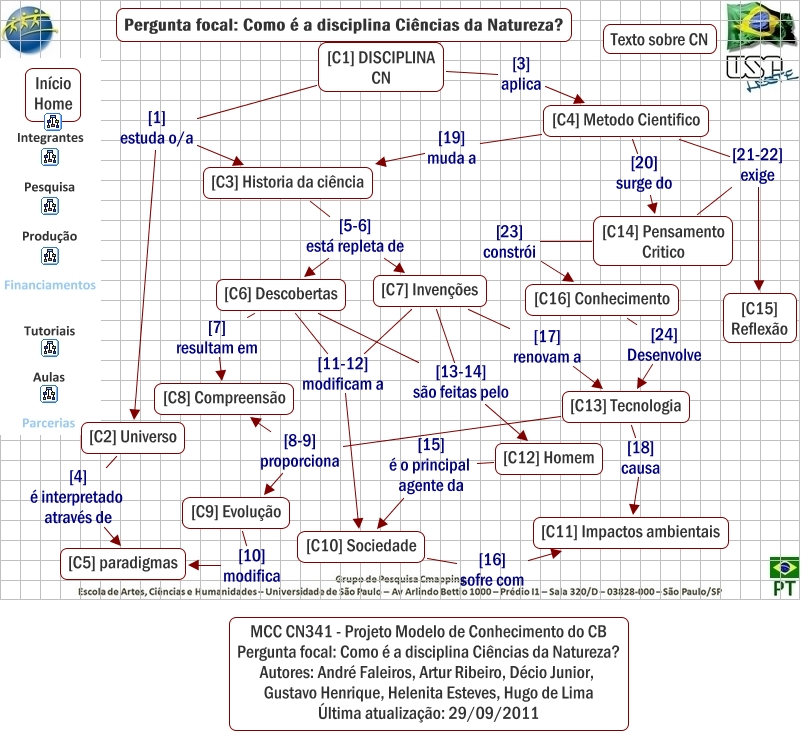 This Concept Map, created with IHMC CmapTools, has information related to: CN341-v2, [C13] Tecnologia [18] causa [C11] Impactos ambientais, [C14] Pensamento Critico [23] constrói [C16] Conhecimento, [C1] DISCIPLINA CN [1] estuda o/a [C2] Universo, [C9] Evolução [10] modifica [C5] paradigmas, [C3] Historia da ciência [5-6] está repleta de [C7] Invenções, [C7] Invenções [17] renovam a [C13] Tecnologia, [C4] Metodo Cientifico [20] surge do [C14] Pensamento Critico, [C10] Sociedade [16] sofre com [C11] Impactos ambientais, [C4] Metodo Cientifico [19] muda a [C3] Historia da ciência, [C3] Historia da ciência [5-6] está repleta de [C6] Descobertas, [C14] Pensamento Critico [21-22] exige [C15] Reflexão, [C1] DISCIPLINA CN [1] estuda o/a [C3] Historia da ciência, [C6] Descobertas [13-14] são feitas pelo [C12] Homem, [C13] Tecnologia [8-9] proporciona [C8] Compreensão, [C6] Descobertas [7] resultam em [C8] Compreensão, [C2] Universo [4] é interpretado através de [C5] paradigmas, [C16] Conhecimento [24] Desenvolve [C13] Tecnologia, [C1] DISCIPLINA CN [3] aplica [C4] Metodo Cientifico, [C7] Invenções [13-14] são feitas pelo [C12] Homem, [C4] Metodo Cientifico [21-22] exige [C15] Reflexão