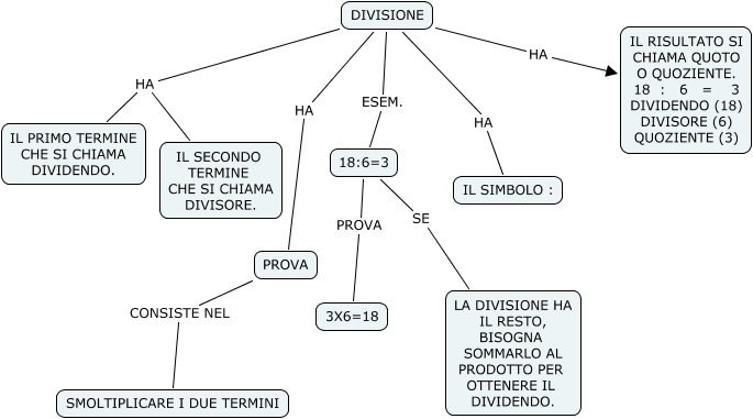 Questa Cmap, creata con IHMC CmapTools, contiene informazioni relative a: DIVISIONE_jennipher, DIVISIONE ESEM. 18:6=3, DIVISIONE HA IL PRIMO TERMINE CHE SI CHIAMA DIVIDENDO., 18:6=3 PROVA 3X6=18, 18:6=3 SE LA DIVISIONE HA IL RESTO, BISOGNA SOMMARLO AL PRODOTTO PER OTTENERE IL DIVIDENDO., DIVISIONE HA IL RISULTATO SI CHIAMA QUOTO O QUOZIENTE. 18 : 6 = 3 DIVIDENDO (18) DIVISORE (6) QUOZIENTE (3), DIVISIONE HA PROVA, DIVISIONE HA IL SECONDO TERMINE CHE SI CHIAMA DIVISORE., DIVISIONE HA IL SIMBOLO :, PROVA CONSISTE NEL SMOLTIPLICARE I DUE TERMINI