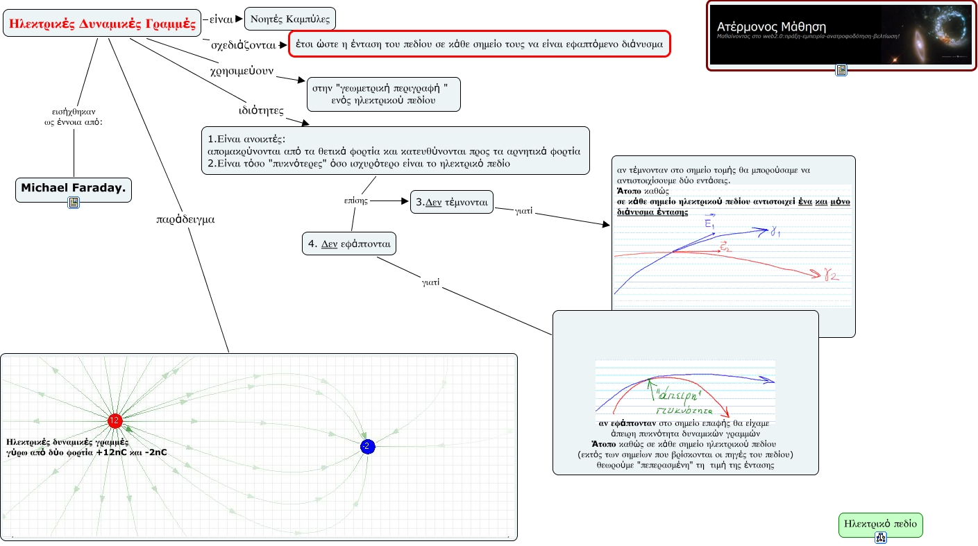 This Concept Map, created with IHMC CmapTools, has information related to: electric field lines, Ηλεκτρικές Δυναμικές Γραμμές σχεδιάζονται έτσι ώστε η ένταση του πεδίου σε κάθε σημείο τους να είναι εφαπτόμενο διάνυσμα, Ηλεκτρικές Δυναμικές Γραμμές παράδειγμα Ηλεκτρικές δυναμικές γραμμές γύρω από δύο φορτία +12nC και -2nC, Ηλεκτρικές Δυναμικές Γραμμές εισήχθηκαν ως έννοια από: Michael Faraday., 4. Δεν εφάπτονται γιατί αν εφάπτονταν στο σημείο επαφής θα είχαμε άπειρη πυκνότητα δυναμικών γραμμών Άτοπο καθώς σε κάθε σημείο ηλεκτρικού πεδίου (εκτός των σημείων που βρίσκονται οι πηγές του πεδίου) θεωρούμε "πεπερασμένη" τη τιμή της έντασης, Ηλεκτρικές Δυναμικές Γραμμές χρησιμεύουν στην "γεωμετρική περιγραφή " ενός ηλεκτρικού πεδίου, 3.Δεν τέμνονται γιατί αν τέμνονταν στο σημείο τομής θα μπορούσαμε να αντιστοιχίσουμε δύο εντάσεις. Άτοπο καθώς σε κάθε σημείο ηλεκτρικού πεδίου αντιστοιχεί ένα και μόνο διάνυσμα έντασης, 1.Είναι ανοικτές: απομακρύνονται από τα θετικά φορτία και κατευθύνονται προς τα αρνητικά φορτία 2.Είναι τόσο "πυκνότερες" όσο ισχυρότερο είναι το ηλεκτρικό πεδίο επίσης 3.Δεν τέμνονται, 1.Είναι ανοικτές: απομακρύνονται από τα θετικά φορτία και κατευθύνονται προς τα αρνητικά φορτία 2.Είναι τόσο "πυκνότερες" όσο ισχυρότερο είναι το ηλεκτρικό πεδίο επίσης 4. Δεν εφάπτονται, Ηλεκτρικές Δυναμικές Γραμμές είναι Νοητές Καμπύλες, Ηλεκτρικές Δυναμικές Γραμμές ιδιότητες 1.Είναι ανοικτές: απομακρύνονται από τα θετικά φορτία και κατευθύνονται προς τα αρνητικά φορτία 2.Είναι τόσο "πυκνότερες" όσο ισχυρότερο είναι το ηλεκτρικό πεδίο