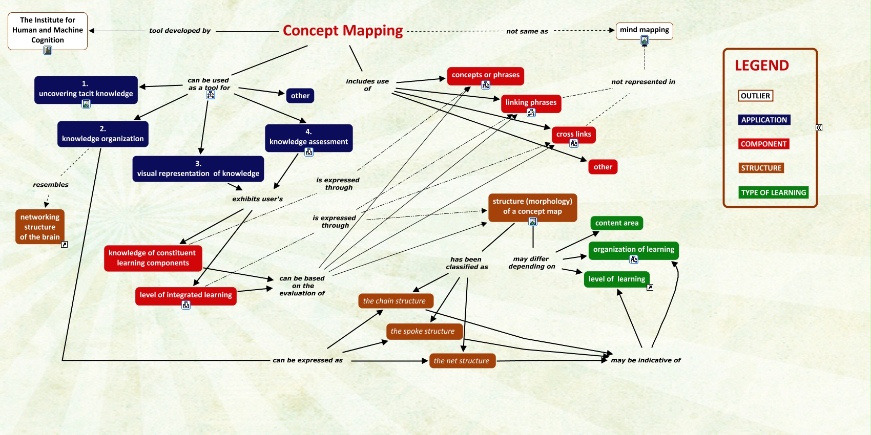 This Concept Map, created with IHMC CmapTools, has information related to: old_Viktoria_CMapping, the net structure may be indicative of level of learning, Concept Mapping includes use of cross links, Concept Mapping includes use of linking phrases, Concept Mapping can be used as a tool for 3. visual representation of knowledge, Concept Mapping can be used as a tool for 2. knowledge organization, structure (morphology) of a concept map may differ depending on level of learning, level of integrated learning is expressed through linking phrases, Concept Mapping includes use of concepts or phrases, the chain structure may be indicative of organization of learning, cross links not represented in mind mapping, 4. knowledge assessment exhibits user's level of integrated learning, Concept Mapping tool developed by The Institute for Human and Machine Cognition, 3. visual representation of knowledge exhibits user's knowledge of constituent learning components, Concept Mapping not same as mind mapping, Concept Mapping can be used as a tool for 1. uncovering tacit knowledge, level of integrated learning can be based on the evaluation of concepts or phrases, 2. knowledge organization resembles networking structure of the brain, structure (morphology) of a concept map has been classified as the net structure, knowledge of constituent learning components can be based on the evaluation of structure (morphology) of a concept map, Concept Mapping can be used as a tool for other