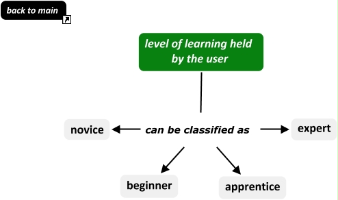 This Concept Map, created with IHMC CmapTools, has information related to: LEVELS, level of learning held by the user can be classified as apprentice, level of learning held by the user can be classified as beginner, level of learning held by the user can be classified as expert, level of learning held by the user can be classified as novice