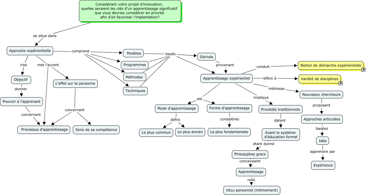 Cette carte de concepts créée avec IHMC CmapTools traite de: Clés d'un apprentisage significatif Volet2Travail1, Considérant votre projet d'innovation, quelles seraient les clés d'un apprentissage significatif que vous devriez considérer en priorité afin d'en favoriser l'implantation? se situe dans Approche expérientielle, Mode d'apprentissage défini Le plus ancien, L'effet sur la personne concernant Processus d'apprentissage, Approche expérientielle comprend Techniques, Apprentissage expérientiel conduit Notion de démarche expérientielle, Pouvoir à l'apprenant concernant Processus d'apprentissage, Apprentissage expérientiel implique Procédés traditionnels, Objectif donner Pouvoir à l'apprenant, Méthodes basés Dérivés, Dérivés provenant Apprentissage expérientiel, Apprentissage expérientiel est Mode d'apprentissage, Apprentissage expérientiel intéresse Nouveaux chercheurs, Procédés traditionnels datent Avant le système d'éducation formel, Mode d'apprentissage défini Le plus commun, L'effet sur la personne concernant Sens de sa compétence, Modèles basés Apprentissage expérientiel, Programmes basés Dérivés, Apprentissage expérientiel réfère à Variété de disciplines, Techniques basés Dérivés, Forme d'apprentissage considérée La plus fondamentale