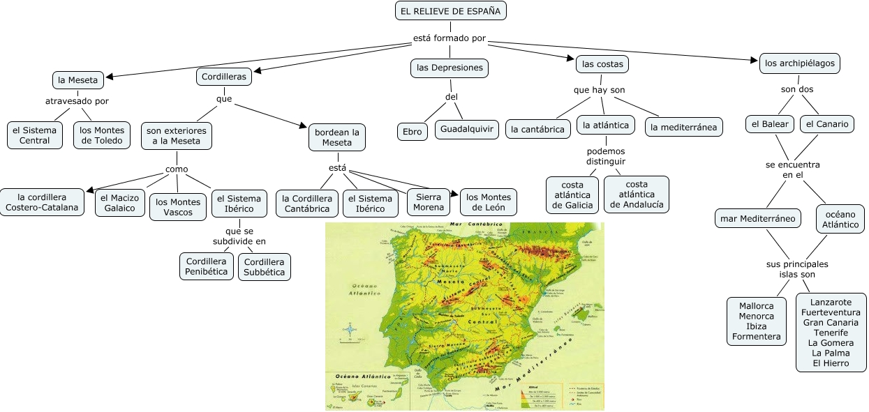 Este Cmap, tiene información relacionada con: EL RELIEVE DE ESPAÑA (Alberto R. y Lucía), EL RELIEVE DE ESPAÑA está formado por las Depresiones, las Depresiones del Ebro, la atlántica podemos distinguir costa atlántica de Galicia, las Depresiones del Guadalquivir, las costas que hay son la mediterránea, son exteriores a la Meseta como el Sistema Ibérico, son exteriores a la Meseta como el Macizo Galaico, son exteriores a la Meseta como la cordillera Costero-Catalana, las costas que hay son la cantábrica, el Balear se encuentra en el mar Mediterráneo, océano Atlántico sus principales islas son Mallorca Menorca Ibiza Formentera, mar Mediterráneo sus principales islas son Lanzarote Fuerteventura Gran Canaria Tenerife La Gomera La Palma El Hierro, la Meseta atravesado por los Montes de Toledo, EL RELIEVE DE ESPAÑA está formado por las costas, el Canario se encuentra en el mar Mediterráneo, el Sistema Ibérico que se subdivide en Cordillera Subbética, el Balear se encuentra en el océano Atlántico, EL RELIEVE DE ESPAÑA está formado por Cordilleras, las costas que hay son la atlántica, océano Atlántico sus principales islas son Lanzarote Fuerteventura Gran Canaria Tenerife La Gomera La Palma El Hierro
