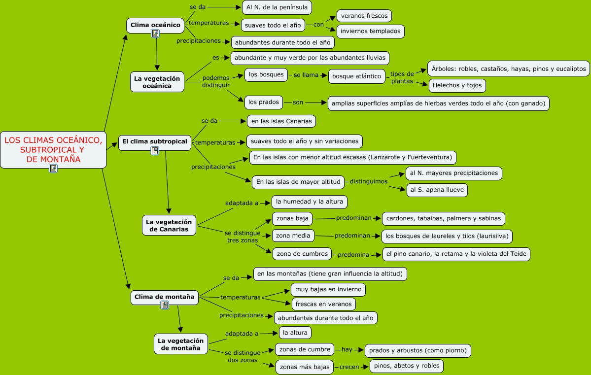 Este Cmap, tiene información relacionada con: Los climas oceánico subtropical y de montaña, El clima subtropical temperaturas suaves todo el año y sin variaciones, Clima de montaña precipitaciones abundantes durante todo el año, Clima de montaña temperaturas frescas en veranos, Clima oceánico se da Al N. de la península, LOS CLIMAS OCEÁNICO, SUBTROPICAL Y DE MONTAÑA ???? Clima de montaña, Clima oceánico precipitaciones abundantes durante todo el año, La vegetación de montaña se distingue dos zonas zonas de cumbre, zona media predominan los bosques de laureles y tilos (laurisilva), La vegetación oceánica es abundante y muy verde por las abundantes lluvias, Clima oceánico ???? La vegetación oceánica, La vegetación de montaña se distingue dos zonas zonas más bajas, La vegetación de Canarias se distingue tres zonas zona media, los bosques se llama bosque atlántico, En las islas de mayor altitud distinguimos al N. mayores precipitaciones, La vegetación de Canarias se distingue tres zonas zonas baja, La vegetación oceánica podemos distinguir los prados, Clima oceánico temperaturas suaves todo el año, zona de cumbres predomina el pino canario, la retama y la violeta del Teide, El clima subtropical ???? La vegetación de Canarias, suaves todo el año con veranos frescos