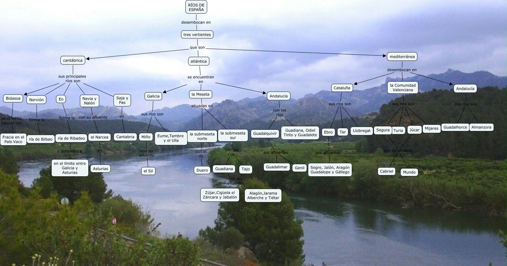Este Cmap, tiene información relacionada con: RÍOS DE ESPAÑA (Marta y Carlos), RÍOS DE ESPAÑA desembocan en tres vertientes, la Meseta situadas en la submeseta norte, Júcar con su afluente Cabriel, Tajo con sus afluentes Alagón,Jarama Alberche y Tiétar, cantábrica sus principales ríos son Nervión, Galicia sus ríos son Eume,Tambre y el Ulla, Cataluña sus ríos son Ebro, tres vertientes que son cantábrica, atlántica se encuentran en Galicia, Ebro sus afluentes Segre, Jalón, Aragón Guadalope y Gállego, la submeseta norte con el río Duero, la submeseta sur con los rios Guadiana, Guadalquivir sus afluentes Genil, Júcar con su afluente Mundo, mediterránea desembocan en Andalucía, Segura con su afluente Cabriel, Andalucía sus ríos son Almanzora, Andalucía sus ríos son Guadalhorce, la Comunidad Valenciana sus ríos son Turia, Cataluña sus ríos son Llobregat