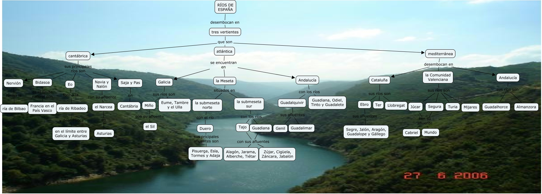 Este Cmap, tiene información relacionada con: RÍOS DE ESPAÑA (Marina y Yago), Tajo con sus afluentes Zújar, Cigüela, Záncara, Jabalón, Guadiana con sus afluentes Zújar, Cigüela, Záncara, Jabalón, tres vertientes que son atlántica, Cataluña sus ríos son Llobregat, Galicia sus ríos son Miño, cantábrica sus principales ríos son Saja y Pas, atlántica se encuentran en Galicia, Segura con su afluente Cabriel, Andalucía sus ríos son Almanzora, la submeseta norte con el río Duero, tres vertientes que son mediterránea, Cataluña sus ríos son Ebro, atlántica se encuentran en Andalucía, Duero sus pricipales afluentes son Pisuerga, Esla, Tormes y Adaja, Júcar con su afluente Mundo, atlántica se encuentran en la Meseta, mediterránea desembocan en Cataluña, Segura con su afluente Mundo, Guadalquivir sus afluentes Guadalimar, cantábrica sus principales ríos son Bidasoa