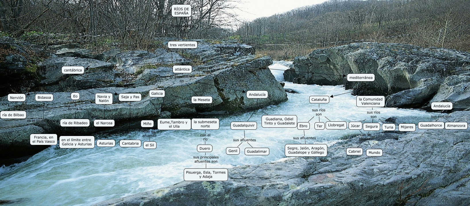 Este Cmap, tiene información relacionada con: RÍOS DE ESPAÑA (Raúl y Sergio), Miño con su afluente el Sil, ría de Ribadeo y desemboca en el límite entre Galicia y Asturias, Cataluña sus ríos son Ebro, atlántica se encuentran en Andalucía, la submeseta norte con el río Duero, cantábrica sus principales ríos son Bidasoa, la Comunidad Valenciana sus ríos son Segura, Andalucía sus ríos son Guadalhorce, Júcar con su afluente Mundo, cantábrica sus principales ríos son Nervión, Segura con su afluente Cabriel, mediterránea desembocan en Andalucía, Guadalquivir sus afluentes Genil, mediterránea desembocan en Cataluña, el Narcea en Asturias, Ebro sus afluentes Segre, Jalón, Aragón, Guadalope y Gállego, Andalucía con los ríos Guadalquivir, tres vertientes que son atlántica, Segura con su afluente Mundo, cantábrica sus principales ríos son Eo