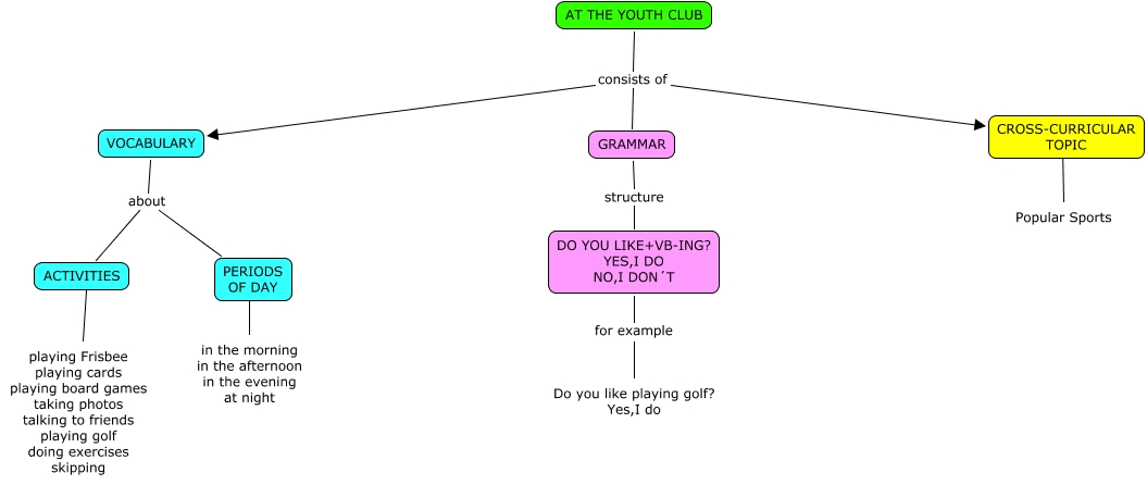 Este Cmap, tiene información relacionada con: AT THE YOUTH CLUB (Andrea y Paco), VOCABULARY about PERIODS OF DAY, ACTIVITIES ???? playing Frisbee playing cards playing board games taking photos talking to friends playing golf doing exercises skipping, VOCABULARY about ACTIVITIES, PERIODS OF DAY ???? in the morning in the afternoon in the evening at night, AT THE YOUTH CLUB consists of CROSS-CURRICULAR TOPIC, GRAMMAR structure DO YOU LIKE+VB-ING? YES,I DO NO,I DON´T, AT THE YOUTH CLUB consists of VOCABULARY, DO YOU LIKE+VB-ING? YES,I DO NO,I DON´T for example Do you like playing golf? Yes,I do, CROSS-CURRICULAR TOPIC ???? Popular Sports, AT THE YOUTH CLUB consists of GRAMMAR