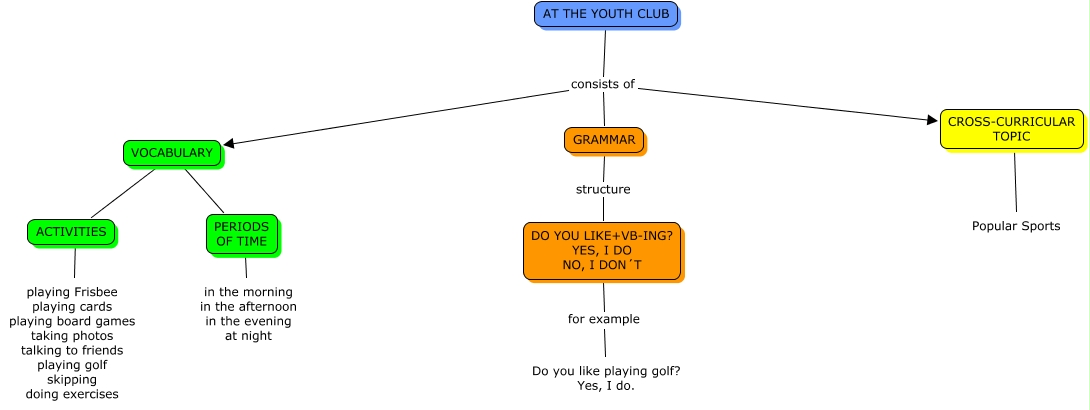 Este Cmap, tiene información relacionada con: AT THE YOUTH CLUB (César y Marcos), Popular Sports ???? CROSS-CURRICULAR TOPIC, VOCABULARY ???? ACTIVITIES, PERIODS OF TIME ???? in the morning in the afternoon in the evening at night, VOCABULARY ???? PERIODS OF TIME, AT THE YOUTH CLUB consists of CROSS-CURRICULAR TOPIC, AT THE YOUTH CLUB consists of VOCABULARY, AT THE YOUTH CLUB consists of GRAMMAR, ACTIVITIES ???? playing Frisbee playing cards playing board games taking photos talking to friends playing golf skipping doing exercises, DO YOU LIKE+VB-ING? YES, I DO NO, I DON´T for example Do you like playing golf? Yes, I do., GRAMMAR structure DO YOU LIKE+VB-ING? YES, I DO NO, I DON´T