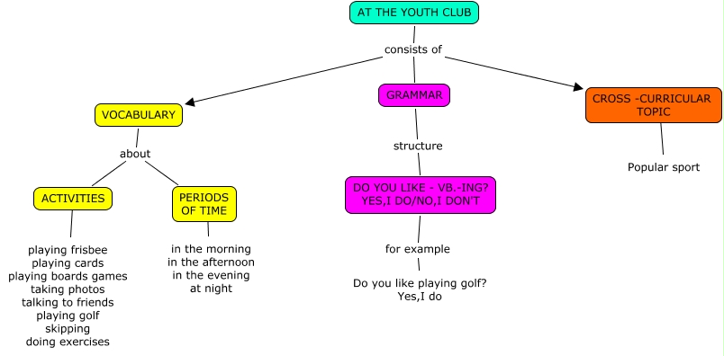 Este Cmap, tiene información relacionada con: AT THE YOUTH CLUB (Hugo y Zaira), AT THE YOUTH CLUB consists of CROSS -CURRICULAR TOPIC, ACTIVITIES ???? playing frisbee playing cards playing boards games taking photos talking to friends playing golf skipping doing exercises, GRAMMAR structure DO YOU LIKE - VB.-ING? YES,I DO/NO,I DON'T, VOCABULARY about ACTIVITIES, AT THE YOUTH CLUB consists of VOCABULARY, VOCABULARY about PERIODS OF TIME, PERIODS OF TIME ???? in the morning in the afternoon in the evening at night, CROSS -CURRICULAR TOPIC ???? Popular sport, AT THE YOUTH CLUB consists of GRAMMAR, DO YOU LIKE - VB.-ING? YES,I DO/NO,I DON'T for example Do you like playing golf? Yes,I do