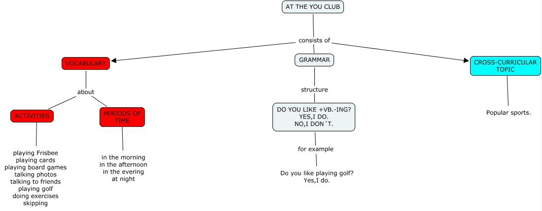 Este Cmap, tiene información relacionada con: AT THE YOUTH CLUB (Álvaro y Irene), GRAMMAR structure DO YOU LIKE +VB.-ING? YES,I DO. NO,I DON´T., VOCABULARY about PERIODS OF TIME, VOCABULARY about ACTIVITIES, DO YOU LIKE +VB.-ING? YES,I DO. NO,I DON´T. for example Do you like playing golf? Yes,I do., PERIODS OF TIME ???? in the morning in the afternoon in the evering at night, AT THE YOU CLUB consists of VOCABULARY, CROSS-CURRICULAR TOPIC ???? Popular sports., ACTIVITIES ???? playing Frisbee playing cards playing board games talking photos talking to friends playing golf doing exercises skipping, AT THE YOU CLUB consists of GRAMMAR, AT THE YOU CLUB consists of CROSS-CURRICULAR TOPIC
