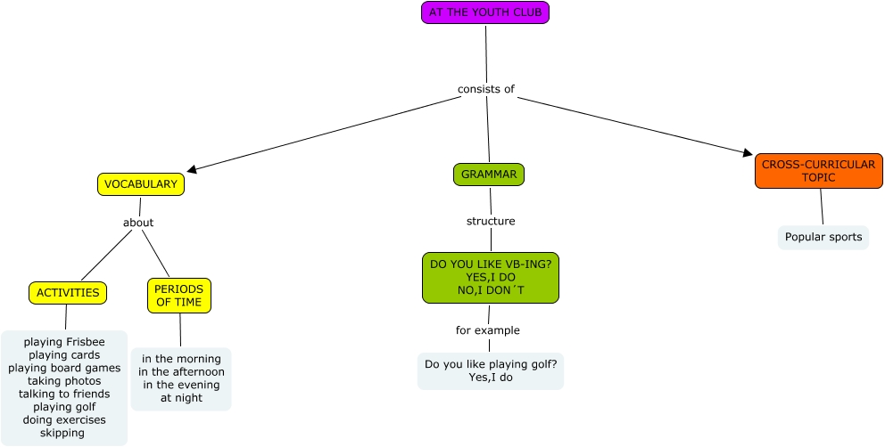 Este Cmap, tiene información relacionada con: AT THE YOUTH CLUB(Diego,Sofia,Hilenia), GRAMMAR structure DO YOU LIKE VB-ING? YES,I DO NO,I DON´T, PERIODS OF TIME ???? in the morning in the afternoon in the evening at night, VOCABULARY about ACTIVITIES, AT THE YOUTH CLUB consists of VOCABULARY, CROSS-CURRICULAR TOPIC ???? Popular sports, AT THE YOUTH CLUB consists of GRAMMAR, VOCABULARY about PERIODS OF TIME, ACTIVITIES ???? playing Frisbee playing cards playing board games taking photos talking to friends playing golf doing exercises skipping, AT THE YOUTH CLUB consists of CROSS-CURRICULAR TOPIC, DO YOU LIKE VB-ING? YES,I DO NO,I DON´T for example Do you like playing golf? Yes,I do