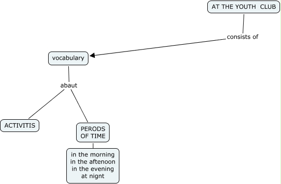 Este Cmap, tiene información relacionada con: AT THE YOUTH CLUB (Adrian,paloma), vocabulary abaut ACTIVITIS, PERODS OF TIME ???? in the morning in the aftenoon in the evening at nignt, vocabulary abaut PERODS OF TIME, AT THE YOUTH CLUB consists of vocabulary