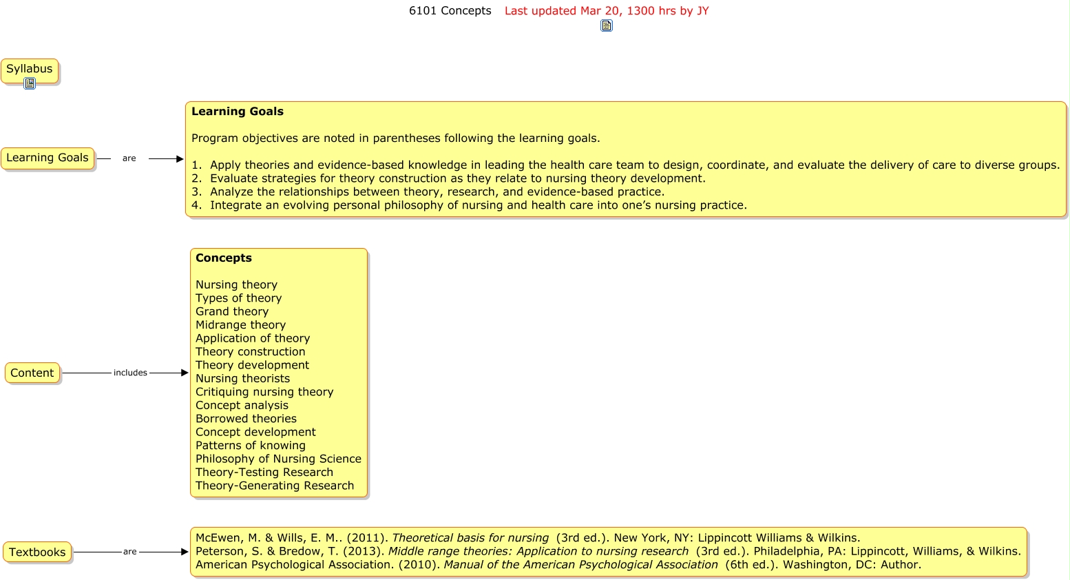 This Concept Map, created with IHMC CmapTools, has information related to: 6101, Textbooks are McEwen, M. & Wills, E. M.. (2011). Theoretical basis for nursing (3rd ed.). New York, NY: Lippincott Williams & Wilkins. Peterson, S. & Bredow, T. (2013). Middle range theories: Application to nursing research (3rd ed.). Philadelphia, PA: Lippincott, Williams, & Wilkins. American Psychological Association. (2010). Manual of the American Psychological Association (6th ed.). Washington, DC: Author., Content includes Concepts Nursing theory Types of theory Grand theory Midrange theory Application of theory Theory construction Theory development Nursing theorists Critiquing nursing theory Concept analysis Borrowed theories Concept development Patterns of knowing Philosophy of Nursing Science Theory-Testing Research Theory-Generating Research, Learning Goals are Learning Goals Program objectives are noted in parentheses following the learning goals. 1. Apply theories and evidence-based knowledge in leading the health care team to design, coordinate, and evaluate the delivery of care to diverse groups. 2. Evaluate strategies for theory construction as they relate to nursing theory development. 3. Analyze the relationships between theory, research, and evidence-based practice. 4. Integrate an evolving personal philosophy of nursing and health care into one’s nursing practice.