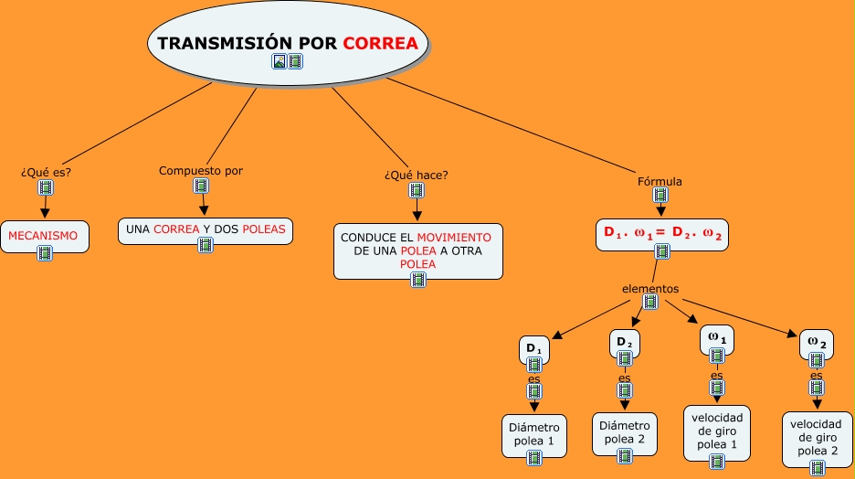Este Cmap, tiene información relacionada con: TRANSMISIÓN POR CORREA, <math xmlns="http://www.w3.org/1998/Math/MathML"> <mrow> <mmultiscripts> <mtext> D </mtext> <mtext> 2 </mtext> <none/> </mmultiscripts> </mrow> </math> es Diámetro polea 2, <math xmlns="http://www.w3.org/1998/Math/MathML"> <mrow> <mmultiscripts> <mtext> ω </mtext> <mtext> 2 </mtext> <none/> </mmultiscripts> </mrow> </math> es velocidad de giro polea 2, <math xmlns="http://www.w3.org/1998/Math/MathML"> <mrow> <mmultiscripts> <mtext> D </mtext> <mtext> 1 </mtext> <none/> </mmultiscripts> <mtext> . </mtext> <mmultiscripts> <mtext> ω </mtext> <mtext> 1 </mtext> <none/> </mmultiscripts> <mtext> = </mtext> <mmultiscripts> <mtext> D </mtext> <mtext> 2 </mtext> <none/> </mmultiscripts> <mtext> . </mtext> <mmultiscripts> <mtext> ω </mtext> <mtext> 2 </mtext> <none/> </mmultiscripts> </mrow> </math> elementos <math xmlns="http://www.w3.org/1998/Math/MathML"> <mrow> <mmultiscripts> <mtext> ω </mtext> <mtext> 2 </mtext> <none/> </mmultiscripts> </mrow> </math>, TRANSMISIÓN POR CORREA ¿Qué es? MECANISMO, <math xmlns="http://www.w3.org/1998/Math/MathML"> <mrow> <mmultiscripts> <mtext> ω </mtext> <mtext> 1 </mtext> <none/> </mmultiscripts> </mrow> </math> es velocidad de giro polea 1, <math xmlns="http://www.w3.org/1998/Math/MathML"> <mrow> <mmultiscripts> <mtext> D </mtext> <mtext> 1 </mtext> <none/> </mmultiscripts> <mtext> . </mtext> <mmultiscripts> <mtext> ω </mtext> <mtext> 1 </mtext> <none/> </mmultiscripts> <mtext> = </mtext> <mmultiscripts> <mtext> D </mtext> <mtext> 2 </mtext> <none/> </mmultiscripts> <mtext> . </mtext> <mmultiscripts> <mtext> ω </mtext> <mtext> 2 </mtext> <none/> </mmultiscripts> </mrow> </math> elementos <math xmlns="http://www.w3.org/1998/Math/MathML"> <mrow> <mmultiscripts> <mtext> D </mtext> <mtext> 2 </mtext> <none/> </mmultiscripts> </mrow> </math>, TRANSMISIÓN POR CORREA Fórmula <math xmlns="http://www.w3.org/1998/Math/MathML"> <mrow> <mmultiscripts> <mtext> D </mtext> <mtext> 1 </mtext> <none/> </mmultiscripts> <mtext> . </mtext> <mmultiscripts> <mtext> ω </mtext> <mtext> 1 </mtext> <none/> </mmultiscripts> <mtext> = </mtext> <mmultiscripts> <mtext> D </mtext> <mtext> 2 </mtext> <none/> </mmultiscripts> <mtext> . </mtext> <mmultiscripts> <mtext> ω </mtext> <mtext> 2 </mtext> <none/> </mmultiscripts> </mrow> </math>, TRANSMISIÓN POR CORREA ¿Qué hace? CONDUCE EL MOVIMIENTO DE UNA POLEA A OTRA POLEA, TRANSMISIÓN POR CORREA Compuesto por UNA CORREA Y DOS POLEAS, <math xmlns="http://www.w3.org/1998/Math/MathML"> <mrow> <mmultiscripts> <mtext> D </mtext> <mtext> 1 </mtext> <none/> </mmultiscripts> <mtext> . </mtext> <mmultiscripts> <mtext> ω </mtext> <mtext> 1 </mtext> <none/> </mmultiscripts> <mtext> = </mtext> <mmultiscripts> <mtext> D </mtext> <mtext> 2 </mtext> <none/> </mmultiscripts> <mtext> . </mtext> <mmultiscripts> <mtext> ω </mtext> <mtext> 2 </mtext> <none/> </mmultiscripts> </mrow> </math> elementos <math xmlns="http://www.w3.org/1998/Math/MathML"> <mrow> <mmultiscripts> <mtext> ω </mtext> <mtext> 1 </mtext> <none/> </mmultiscripts> </mrow> </math>, <math xmlns="http://www.w3.org/1998/Math/MathML"> <mrow> <mmultiscripts> <mtext> D </mtext> <mtext> 1 </mtext> <none/> </mmultiscripts> </mrow> </math> es Diámetro polea 1, <math xmlns="http://www.w3.org/1998/Math/MathML"> <mrow> <mmultiscripts> <mtext> D </mtext> <mtext> 1 </mtext> <none/> </mmultiscripts> <mtext> . </mtext> <mmultiscripts> <mtext> ω </mtext> <mtext> 1 </mtext> <none/> </mmultiscripts> <mtext> = </mtext> <mmultiscripts> <mtext> D </mtext> <mtext> 2 </mtext> <none/> </mmultiscripts> <mtext> . </mtext> <mmultiscripts> <mtext> ω </mtext> <mtext> 2 </mtext> <none/> </mmultiscripts> </mrow> </math> elementos <math xmlns="http://www.w3.org/1998/Math/MathML"> <mrow> <mmultiscripts> <mtext> D </mtext> <mtext> 1 </mtext> <none/> </mmultiscripts> </mrow> </math>