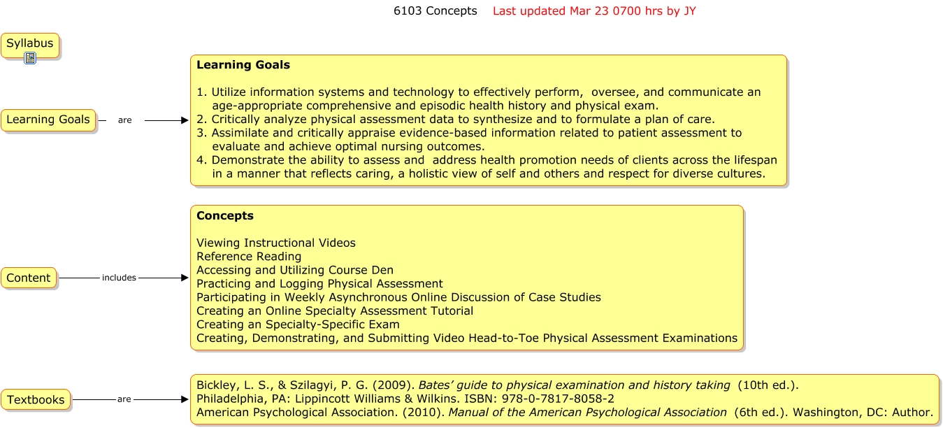 This Concept Map, created with IHMC CmapTools, has information related to: 6103, Textbooks are Bickley, L. S., & Szilagyi, P. G. (2009). Bates’ guide to physical examination and history taking (10th ed.). Philadelphia, PA: Lippincott Williams & Wilkins. ISBN: 978-0-7817-8058-2 American Psychological Association. (2010). Manual of the American Psychological Association (6th ed.). Washington, DC: Author., Content includes Concepts Viewing Instructional Videos Reference Reading Accessing and Utilizing Course Den Practicing and Logging Physical Assessment Participating in Weekly Asynchronous Online Discussion of Case Studies Creating an Online Specialty Assessment Tutorial Creating an Specialty-Specific Exam Creating, Demonstrating, and Submitting Video Head-to-Toe Physical Assessment Examinations, Learning Goals are Learning Goals 1. Utilize information systems and technology to effectively perform, oversee, and communicate an age-appropriate comprehensive and episodic health history and physical exam. 2. Critically analyze physical assessment data to synthesize and to formulate a plan of care. 3. Assimilate and critically appraise evidence-based information related to patient assessment to evaluate and achieve optimal nursing outcomes. 4. Demonstrate the ability to assess and address health promotion needs of clients across the lifespan in a manner that reflects caring, a holistic view of self and others and respect for diverse cultures.