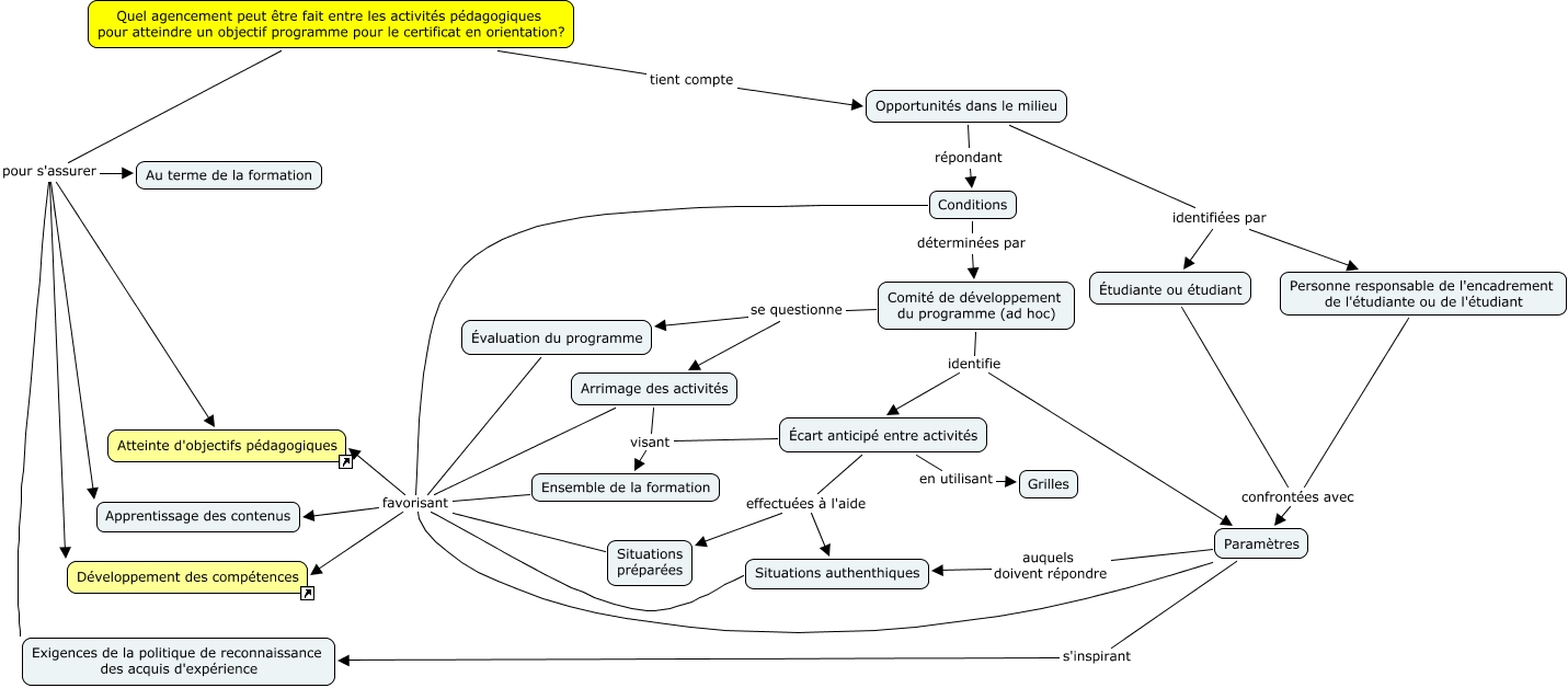Cette carte de concepts créée avec IHMC CmapTools traite de: Agencement activités, Ensemble de la formation favorisant Apprentissage des contenus, Paramètres auquels doivent répondre Situations authenthiques, Situations authenthiques favorisant Développement des compétences, Situations préparées favorisant Atteinte d'objectifs pédagogiques, Évaluation du programme favorisant Apprentissage des contenus, Opportunités dans le milieu identifiées par Personne responsable de l'encadrement de l'étudiante ou de l'étudiant, Arrimage des activités visant Ensemble de la formation, Quel agencement peut être fait entre les activités pédagogiques pour atteindre un objectif programme pour le certificat en orientation? pour s'assurer Apprentissage des contenus, Conditions favorisant Apprentissage des contenus, Paramètres favorisant Développement des compétences, Exigences de la politique de reconnaissance des acquis d'expérience pour s'assurer Atteinte d'objectifs pédagogiques, Comité de développement du programme (ad hoc) se questionne Arrimage des activités, Évaluation du programme favorisant Développement des compétences, Opportunités dans le milieu identifiées par Étudiante ou étudiant, Exigences de la politique de reconnaissance des acquis d'expérience pour s'assurer Au terme de la formation, Écart anticipé entre activités visant Ensemble de la formation, Conditions favorisant Atteinte d'objectifs pédagogiques, Comité de développement du programme (ad hoc) identifie Écart anticipé entre activités, Opportunités dans le milieu répondant Conditions, Situations authenthiques favorisant Apprentissage des contenus
