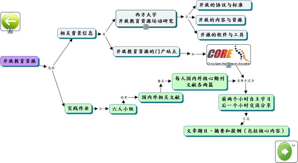 此概念图以 IHMC CmapTools 创建, 内含信息有关于: 第七专题 开放教育资源, 西方大学 开放教育资源运动研究 分 开放的协议与标准, 开放教育资源 包括 相关背景信息, 开放教育资源 包括 实践作业, 西方大学 开放教育资源运动研究 分 开放的内容与资源, 每人国内外核心期刊 文献各两篇 采用方式为 前两个小时自主学习 后一个小时交流分享, 相关背景信息 有 西方大学 开放教育资源运动研究, 采用方式为 前两个小时自主学习 后一个小时交流分享, 前两个小时自主学习 后一个小时交流分享 汇总 文章题目、摘要和提纲(包括核心内容), 开放教育资源的门户站点 如, 西方大学 开放教育资源运动研究 分 开源的软件与工具, 相关背景信息 有 开放教育资源的门户站点, 六人小组 检索 国内外相关文献, 国内外相关文献 要求 每人国内外核心期刊 文献各两篇, 实践作业 分 六人小组