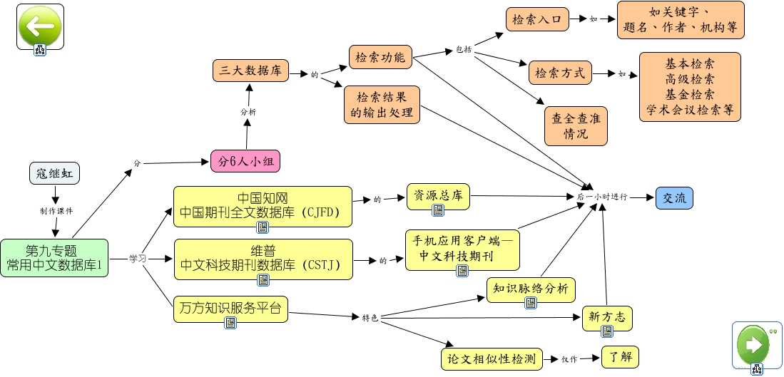 此概念图以 IHMC CmapTools 创建, 内含信息有关于: 第九专题 常用中文库1, 论文相似性检测 仅作 了解, 检索入口 如 如关键字、 题名、作者、机构等, 分6人小组 分析 三大数据库, 三大数据库 的 检索结果 的输出处理, 万方知识服务平台 特色 知识脉络分析, 资源总库 后一小时进行 交流, 检索方式 如 基本检索 高级检索 基金检索 学术会议检索等, 寇继虹 制作课件 第九专题 常用中文数据库1, 中国知网 中国期刊全文数据库(CJFD) 的 资源总库, 三大数据库 的 检索功能, 第九专题 常用中文数据库1 学习 万方知识服务平台, 知识脉络分析 后一小时进行 交流, 万方知识服务平台 特色 论文相似性检测, 检索功能 包括 检索入口, 检索功能 后一小时进行 交流, 检索功能 包括 检索方式, 新方志 后一小时进行 交流, 第九专题 常用中文数据库1 分 分6人小组, 检索功能 包括 查全查准 情况, 手机应用客户端— 中文科技期刊 后一小时进行 交流