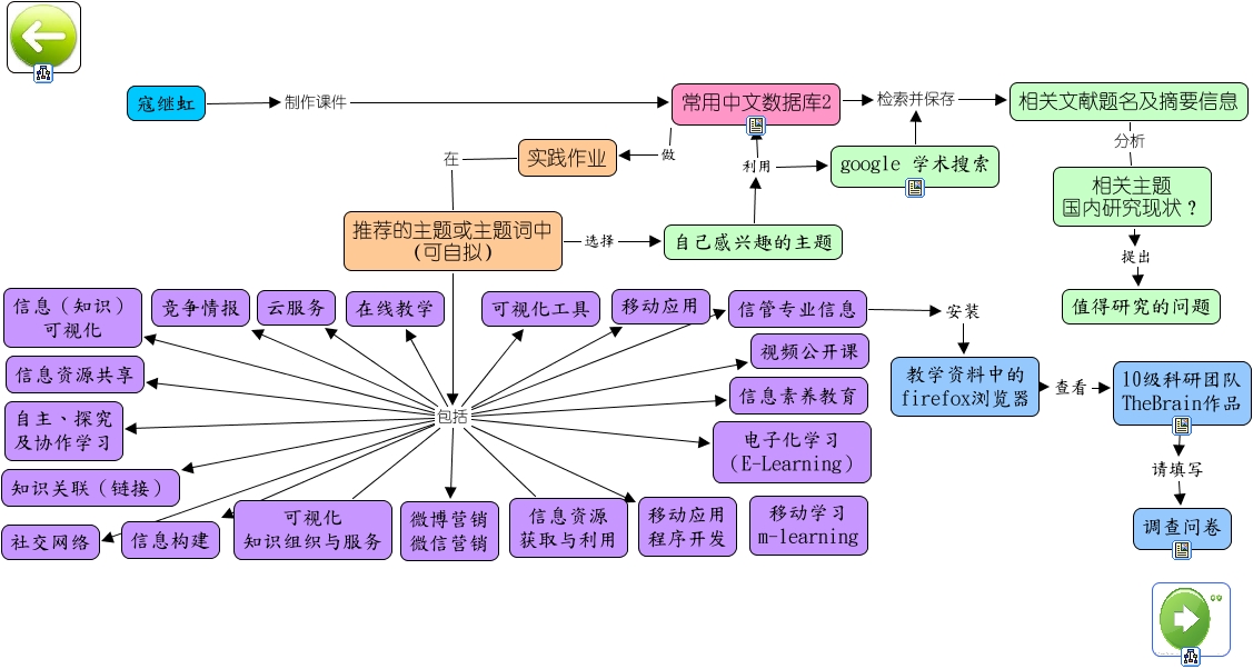 此概念图以 IHMC CmapTools 创建, 内含信息有关于: 第九专题 常用中文库2, 推荐的主题或主题词中 (可自拟) 包括 可视化 知识组织与服务, 推荐的主题或主题词中 (可自拟) 包括 视频公开课, 推荐的主题或主题词中 (可自拟) 包括 云服务, 推荐的主题或主题词中 (可自拟) 包括 信息资源 获取与利用, 常用中文数据库2 检索并保存 相关文献题名及摘要信息, 推荐的主题或主题词中 (可自拟) 选择 自己感兴趣的主题, 推荐的主题或主题词中 (可自拟) 包括 信息构建, google 学术搜索 检索并保存 相关文献题名及摘要信息, 推荐的主题或主题词中 (可自拟) 包括 信管专业信息, 推荐的主题或主题词中 (可自拟) 包括 在线教学, 教学资料中的 firefox浏览器 查看 10级科研团队 TheBrain作品, 自己感兴趣的主题 利用 常用中文数据库2, 10级科研团队 TheBrain作品 请填写 调查问卷, 推荐的主题或主题词中 (可自拟) 包括 电子化学习 (E-Learning), 推荐的主题或主题词中 (可自拟) 包括 竞争情报, 推荐的主题或主题词中 (可自拟) 包括 移动应用, 相关文献题名及摘要信息 分析 相关主题 国内研究现状?, 寇继虹 制作课件 常用中文数据库2, 推荐的主题或主题词中 (可自拟) 包括 社交网络, 推荐的主题或主题词中 (可自拟) 包括 知识关联(链接)