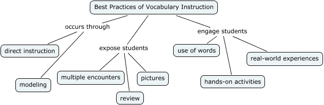 This Concept Map, created with IHMC CmapTools, has information related to: Vocabulary, Best Practices of Vocabulary Instruction expose students review, Best Practices of Vocabulary Instruction engage students real-world experiences, Best Practices of Vocabulary Instruction engage students use of words, Best Practices of Vocabulary Instruction engage students hands-on activities, Best Practices of Vocabulary Instruction expose students pictures, Best Practices of Vocabulary Instruction occurs through direct instruction, Best Practices of Vocabulary Instruction expose students multiple encounters, Best Practices of Vocabulary Instruction occurs through modeling