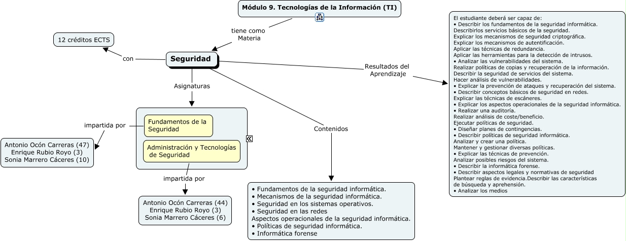 Este Cmap, tiene información relacionada con: Seguridad, Seguridad Contenidos • Fundamentos de la seguridad informática. • Mecanismos de la seguridad informática. • Seguridad en los sistemas operativos. • Seguridad en las redes Aspectos operacionales de la seguridad informática. • Políticas de seguridad informática. • Informática forense, Módulo 9. Tecnologías de la Información (TI) tiene como Materia Seguridad, Administración y Tecnologías de Seguridad impartida por Antonio Ocón Carreras (44) Enrique Rubio Royo (3) Sonia Marrero Cáceres (6), Fundamentos de la Seguridad impartida por Antonio Ocón Carreras (47) Enrique Rubio Royo (3) Sonia Marrero Cáceres (10), Seguridad Asignaturas ????, Seguridad con 12 créditos ECTS, Seguridad Resultados del Aprendizaje El estudiante deberá ser capaz de: • Describir los fundamentos de la seguridad informática. Describirlos servicios básicos de la seguridad. Explicar los mecanismos de seguridad criptográfica. Explicar los mecanismos de autentificación. Aplicar las técnicas de redundancia. Aplicar las herramientas para la detección de intrusos. • Analizar las vulnerabilidades del sistema. Realizar políticas de copias y recuperación de la información. Describir la seguridad de servicios del sistema. Hacer análisis de vulnerabilidades. • Explicar la prevención de ataques y recuperación del sistema. • Describir conceptos básicos de seguridad en redes. Explicar las técnicas de escáneres. • Explicar los aspectos operacionales de la seguridad informática. • Realizar una auditoría. Realizar análisis de coste/beneficio. Ejecutar políticas de seguridad. • Diseñar planes de contingencias. • Describir políticas de seguridad informática. Analizar y crear una política. Mantener y gestionar diversas políticas. • Explicar las técnicas de prevención. Analizar posibles riesgos del sistema. • Describir la informática forense. • Describir aspectos legales y normativas de seguridad Plantear reglas de evidencia.Describir las características de búsqueda y aprehensión. • Analizar los medios